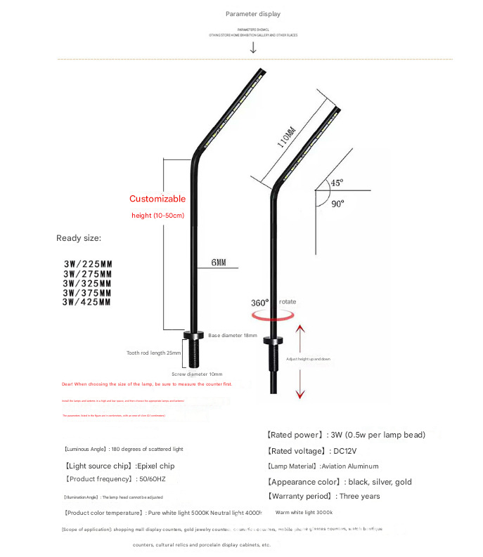 Светодиодный прожектор на стойке, высокий цветопередача, 3W, регулируемая высота для ювелирных витрин, настенный монтаж
