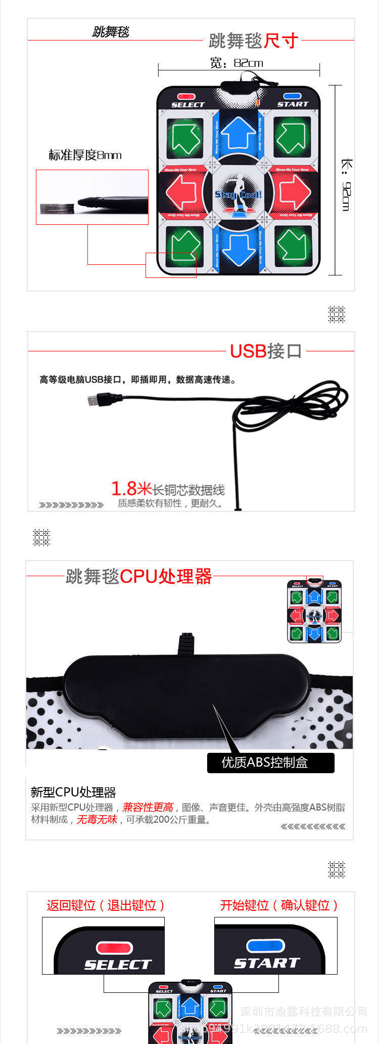 USB11键跳舞毯中间起跳!深圳市渝露顺科技有限公司,专业生产销售跳舞毯 双人跳舞毯,高清跳舞毯,无线毯 发光毯 工厂价格销售!质量放心。价格便宜 悦炫品牌 ,全国代理招商,各种跳舞毯接口 ,多个颜色 欢迎咨询订购 ,可以配英文彩盒和英文光盘,英文说明书,游戏程序英文画质介绍需要的亲联系旺旺!库存颜色为第一个色 其他颜色需要订做,产品本身没有配包装彩盒,如果要配请联系客服!您的满意我们无限动力,追求质量 !