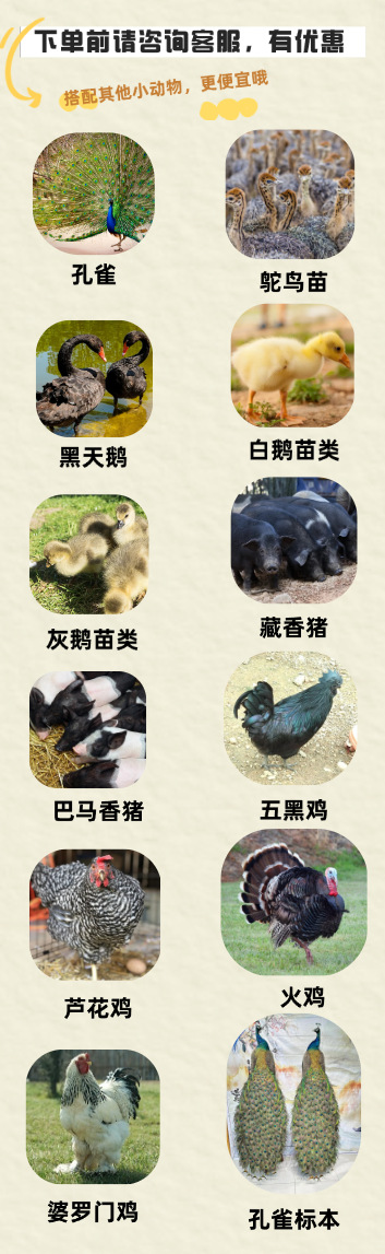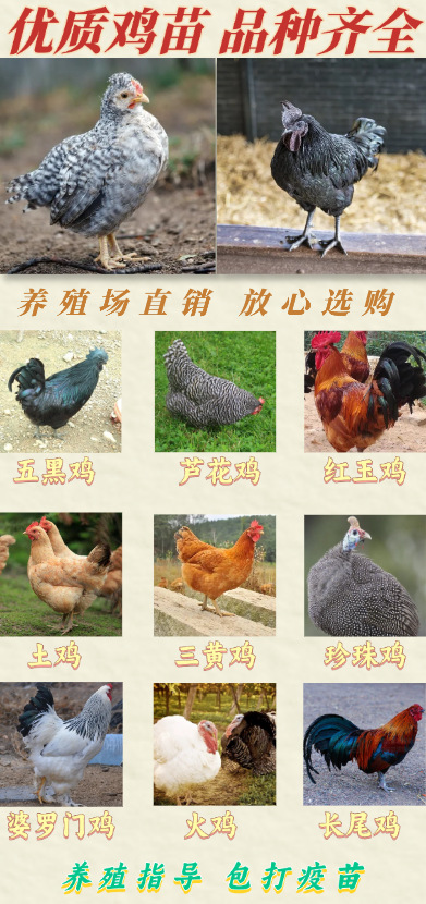 主售品种:五黑鸡;芦花鸡;三黄鸡;红玉鸡;九斤红;珍珠鸡;青脚麻鸡;泰和乌鸡;火鸡;婆罗门鸡等各种优质鸡苗。