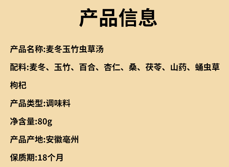 ![]() | Ophiopogon japonicus, polygonatum odoratum and cordyceps sinensis soup 80g | ¥7.66 / ≈ 92 ₽ | 99999999 | 5973220536494 | |