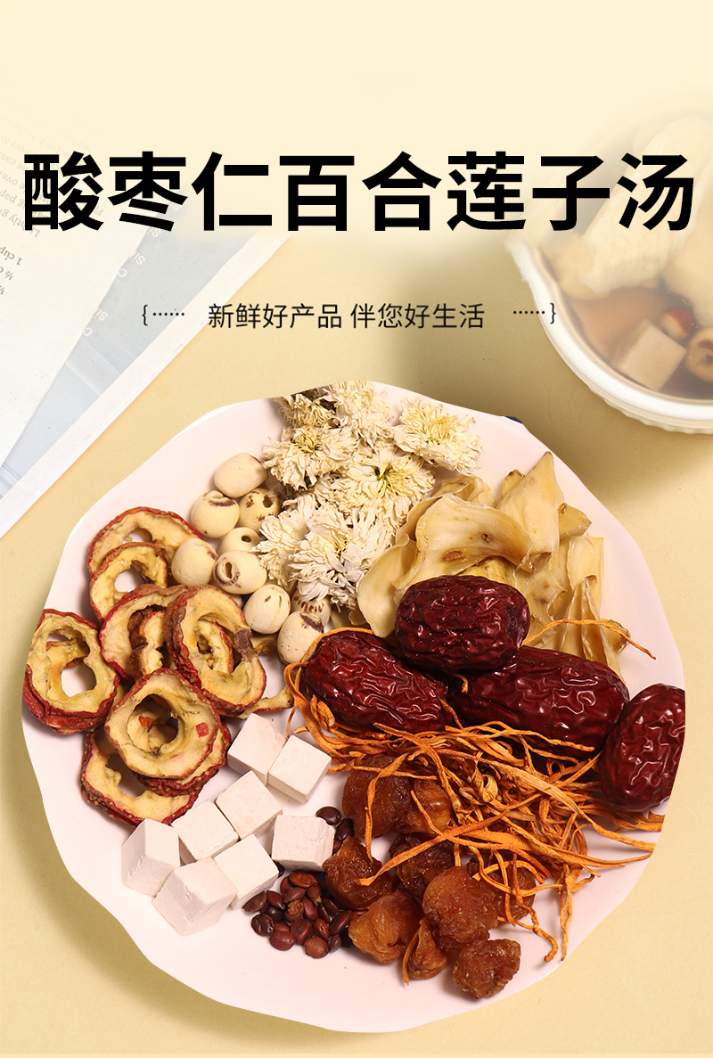 ![]() | Jujube kernel, lily and lotus seed soup 80g | ¥6.0 / ≈ 72 ₽ | 99999999 | 5973220536495 | |