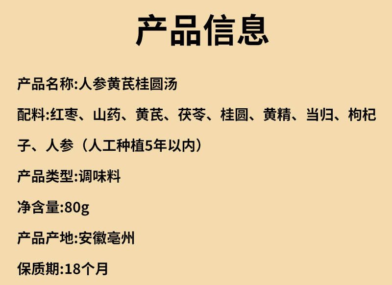 ![]() | Ginseng, astragalus and guiyuan soup 80g | ¥6.94 / ≈ 84 ₽ | 99999999 | 5973220536492 | |