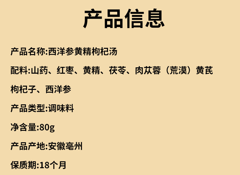 ![]() | American ginseng, yellow essence and wolfberry soup 80g | ¥6.28 / ≈ 76 ₽ | 99999999 | 5973220536496 |