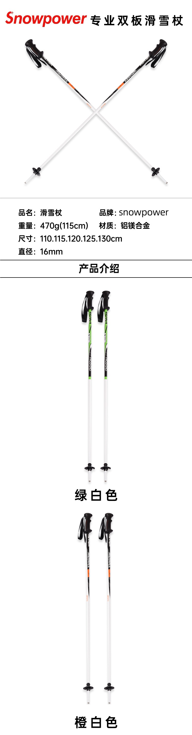 Легкие лыжные палки Snowpower из алюминиево-магниевого сплава для мужчин и женщин 110-130 см