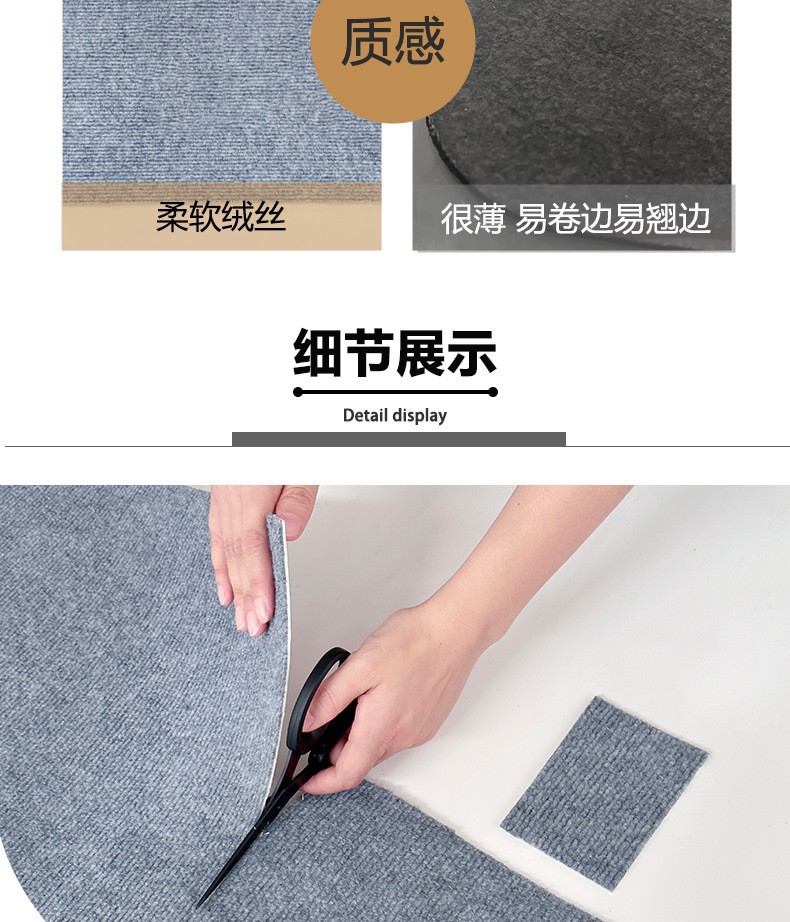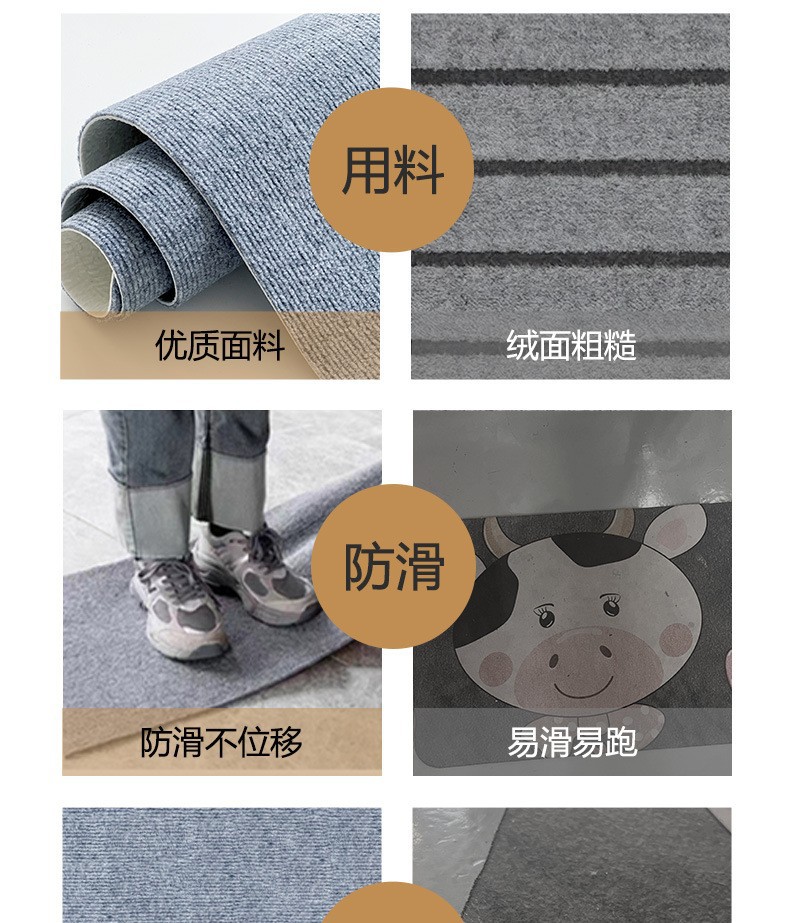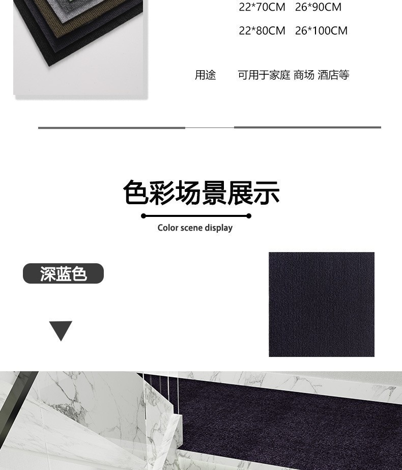 本产品吸附地毯可重复使用,自粘地毯可以粘。22CM*70CM长专供跨境,(也可以定制其他尺寸联系客服)可随意裁剪,浴室垫,宠物垫,楼梯垫,门垫,家用,办公室用等等。普通地毯不能重复使用。