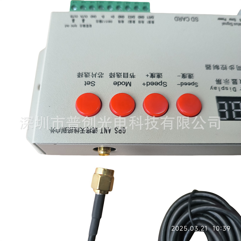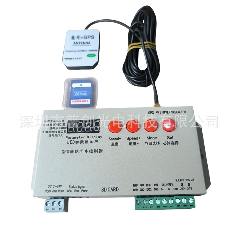 2:使用方式:只要每台机的SD卡内的节目花样排列和数量都一样,速度参数一样。调好后就自动可以同步了,GPS启动后会自动读取各机子的信号,不分先后启动控制器均可以自动对准同步模式。主要应用在多台机子使用时又不能在同一电路供电或是不能拉多台级联网线信号的情况下可以选择GPS使用,如:路灯电线杆灯光,大楼楼体或广告字体,户外灯光秀亮化灯等。