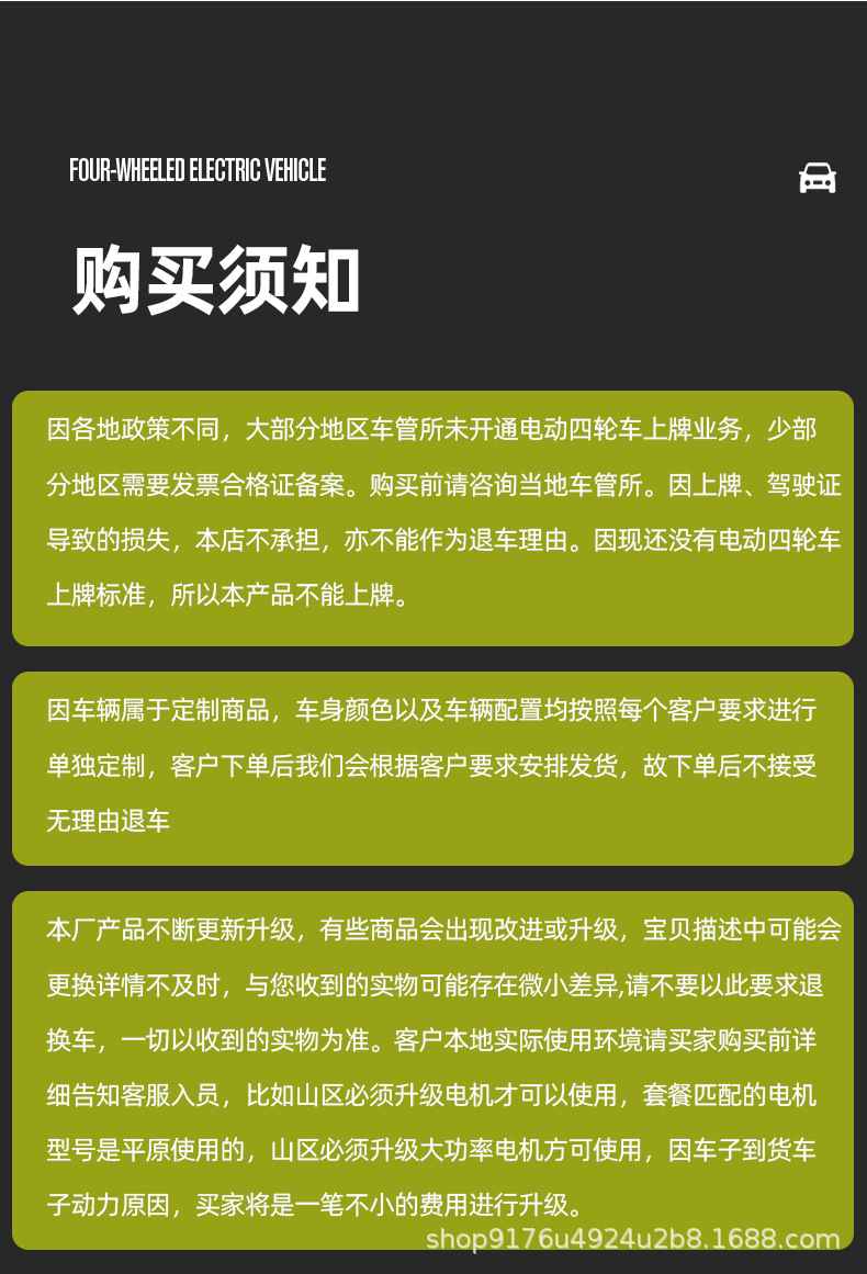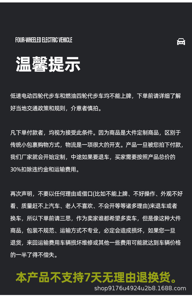 本厂产品会一直不断地求进不断的更新,发出的车辆均为最新款,有时会与宝贝详情图片略有不同,如:车身贴花、内饰颜色、中控样式等,请您放心车辆功能不会减少,品质更不会降低,我们一直追求的是精益求精,本店不接受因车辆升级产生微小变化而产生的退换货。