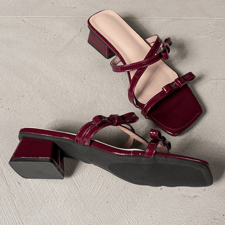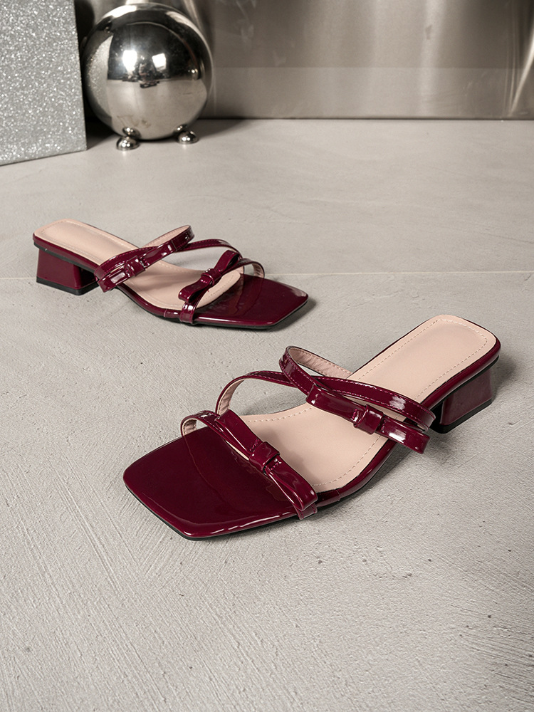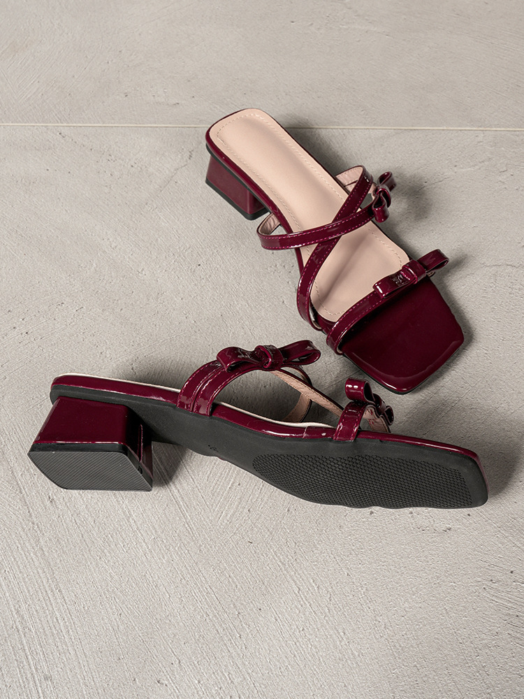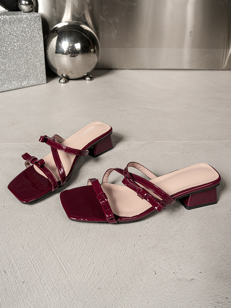 Кросс-бордерные сандалии для женщин 2025 нового стиля, с бантом, толстые каблуки, лаковая кожа, удобные высокие каблуки
