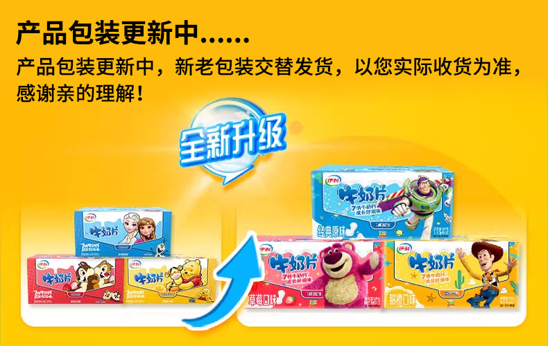 伊利奶片包装时有更新,新老包装随机发货,介意的亲慎拍,给亲带来的不便我们深感歉意!谢谢亲的理解!