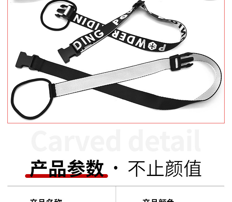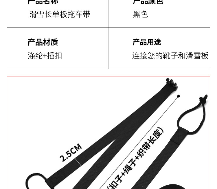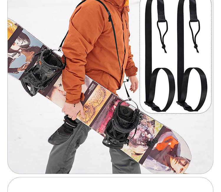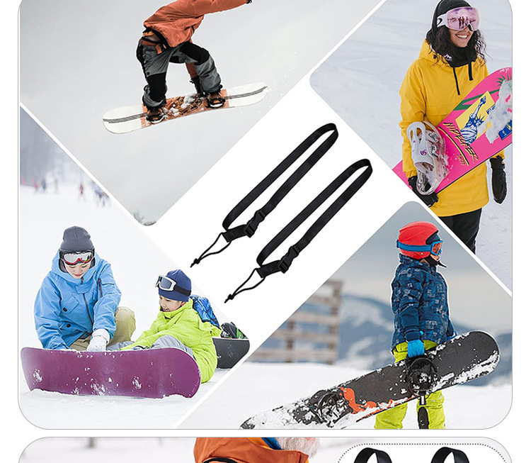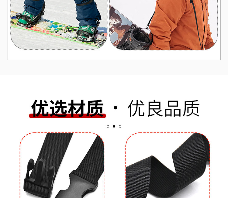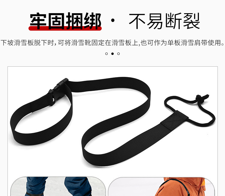 产品作用:它可用于将您的滑雪板靴固定在滑雪板上,以防止在下坡时滑雪板从身体上脱落,从而提高安全性;也可用作滑雪板肩带,滑雪板牵引绳上有一个可调节的扣环,方便根据成人和儿童的实际需求调整