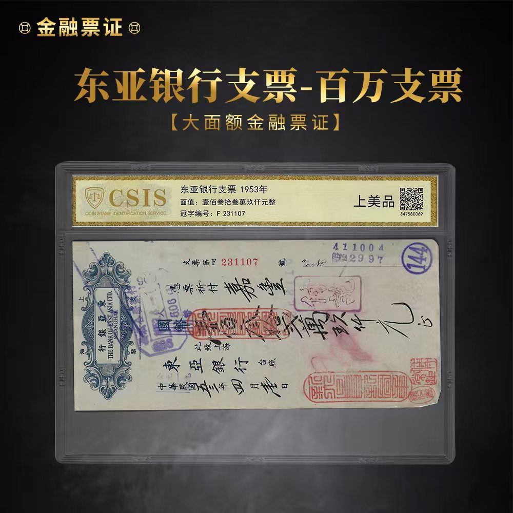 "Сокровища удачи" Восточноазиатский банк - миллионный чек крупной номинальной стоимости, оценка подлинности, коллекция в капсуле