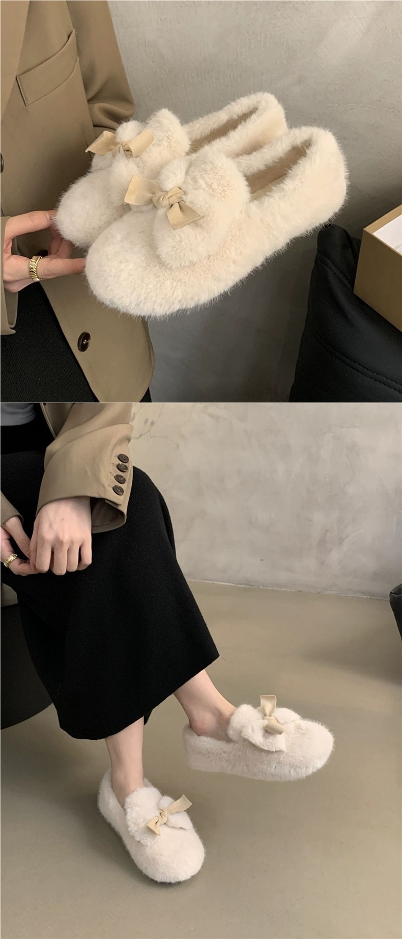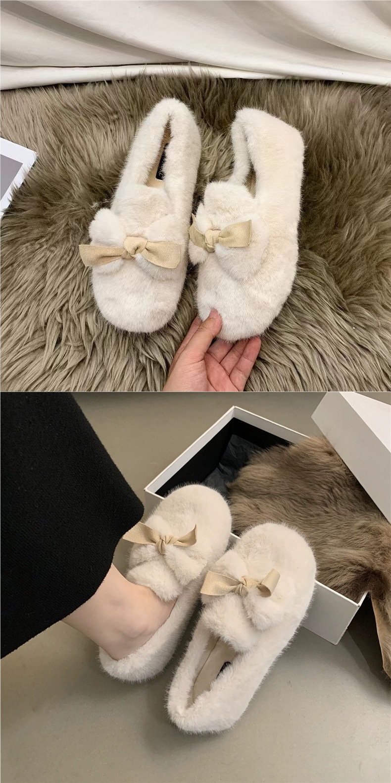 Слипоны для женщин, зимние плюшевые хлопковые туфли, новый стиль 2025 года, обувь с бантом и мехом, уличные плюшевые хлопковые туфли для женщин