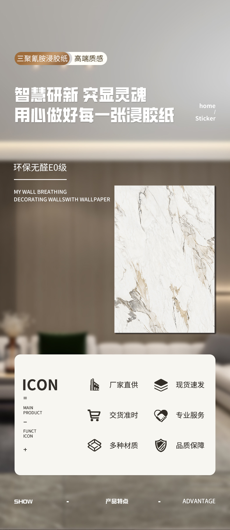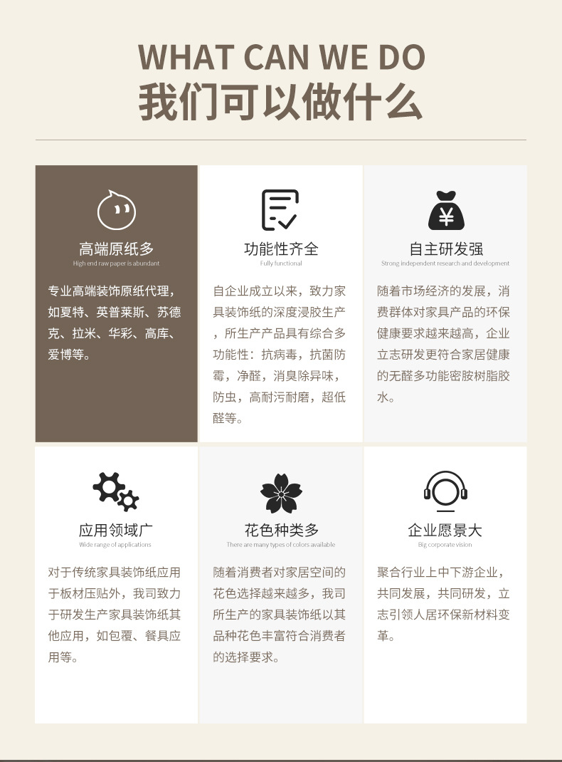 Характеристика Rich colors, strong plasticity, fine texture, uniform texture, multi-functionality: antibacterial and mildew-proof, deodorizing and odor-removing, moisture-proof and insect-proof, low-formaldehyde environmental-friendly, stain-resistant abrasion resistant