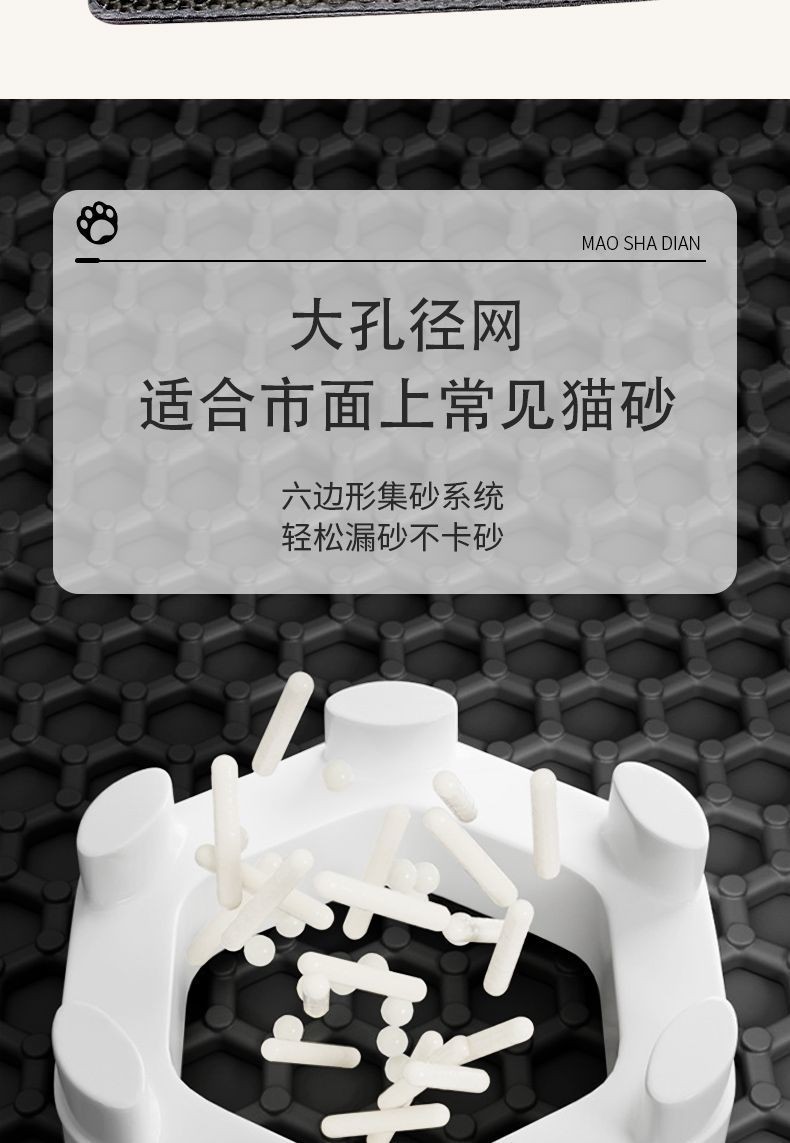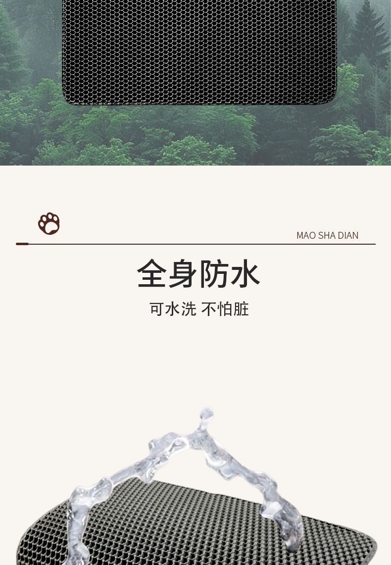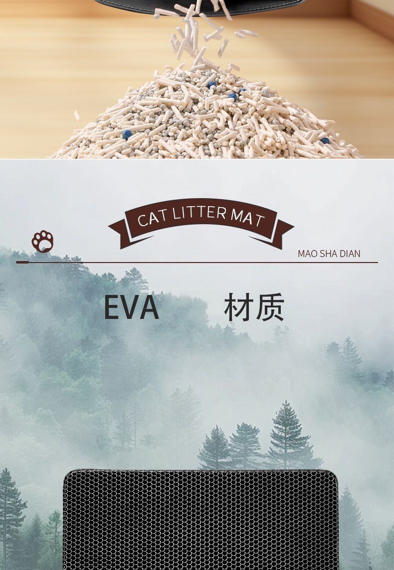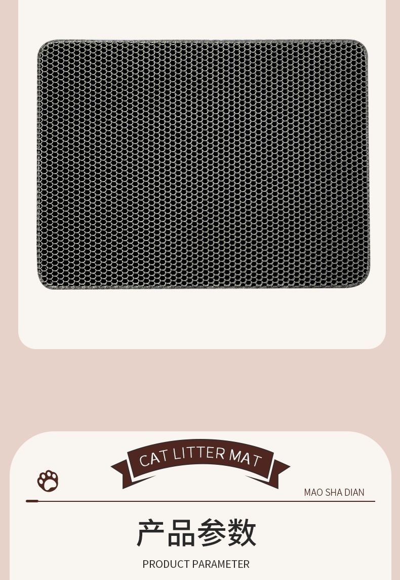 产品功能:适用95%以上种类的猫砂,上层通孔材料,猫砂可轻易通过,下层防水材质,猫砂、小便等脏物可聚集于此。猫砂垫为上下双层设计:上层采用六角形的洞孔凹凸设计,除了让猫砂落入后不再外溅,圆球型的柔滑触感也可以避免猫咪抓坏,下层垫密封专门存放猫砂,底部设计成规则性的圆孔,有效防滑避免横冲直撞的猫咪滑到受伤。采用单边开口设计,能轻松倒出猫砂,完全不麻烦,更不会手忙脚乱,更棒的是猫砂再利用,清洁的同时又省钱。材质精选高弹力的EVA材料, EVA特性为无毒、柔软、可水洗、不闷热,适合喜欢柔软触感的猫咪。尺寸手工测量存在误差1cm。颜色,款式,尺寸可定制。