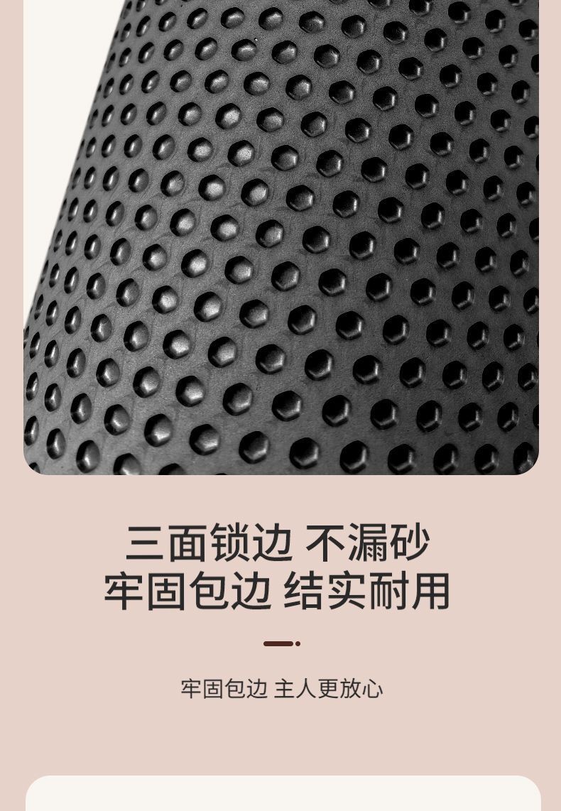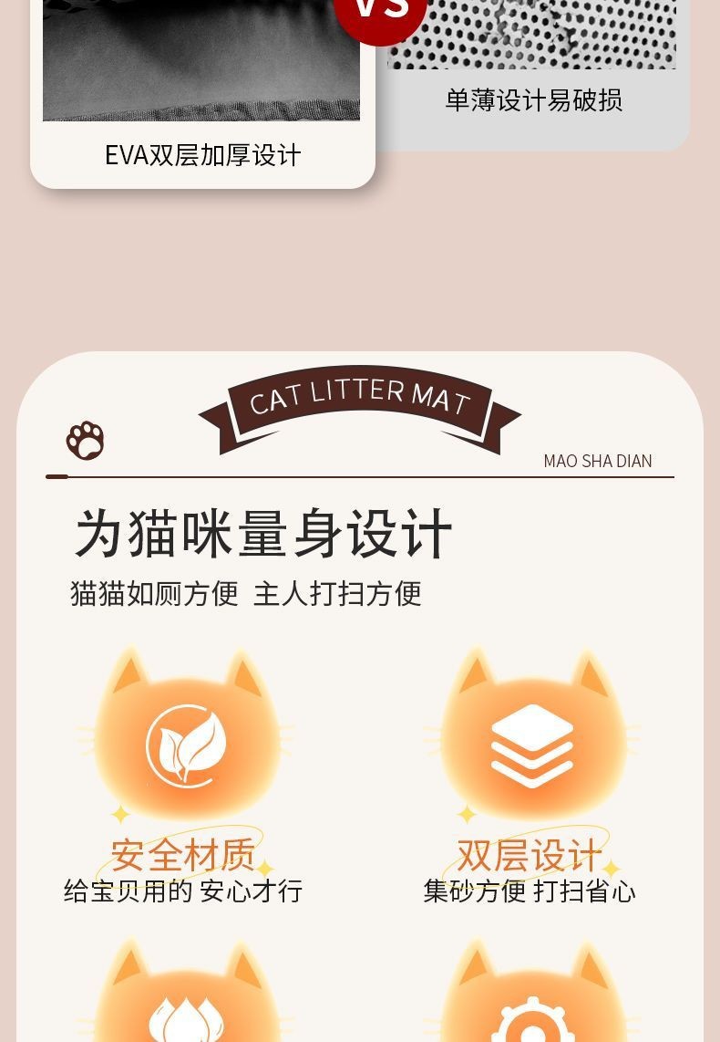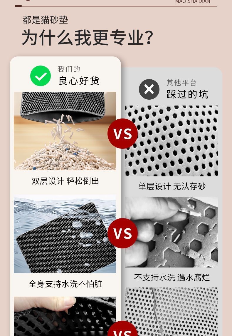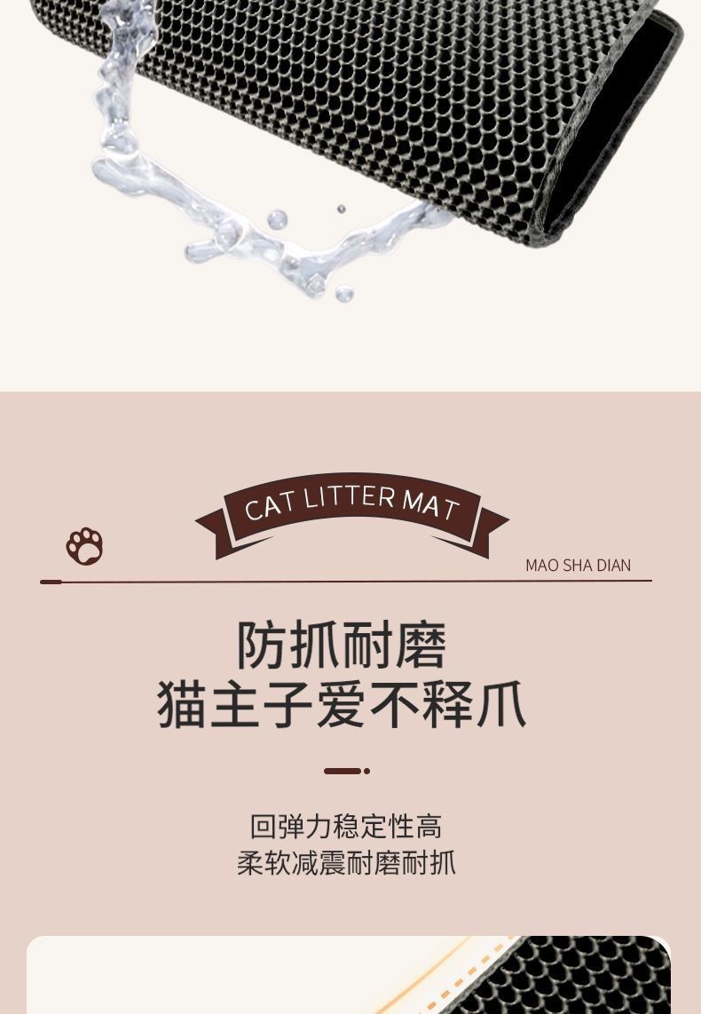产品功能:适用95%以上种类的猫砂,上层通孔材料,猫砂可轻易通过,下层防水材质,猫砂、小便等脏物可聚集于此。猫砂垫为上下双层设计:上层采用六角形的洞孔凹凸设计,除了让猫砂落入后不再外溅,圆球型的柔滑触感也可以避免猫咪抓坏,下层垫密封专门存放猫砂,底部设计成规则性的圆孔,有效防滑避免横冲直撞的猫咪滑到受伤。采用单边开口设计,能轻松倒出猫砂,完全不麻烦,更不会手忙脚乱,更棒的是猫砂再利用,清洁的同时又省钱。材质精选高弹力的EVA材料, EVA特性为无毒、柔软、可水洗、不闷热,适合喜欢柔软触感的猫咪。尺寸手工测量存在误差1cm。颜色,款式,尺寸可定制。