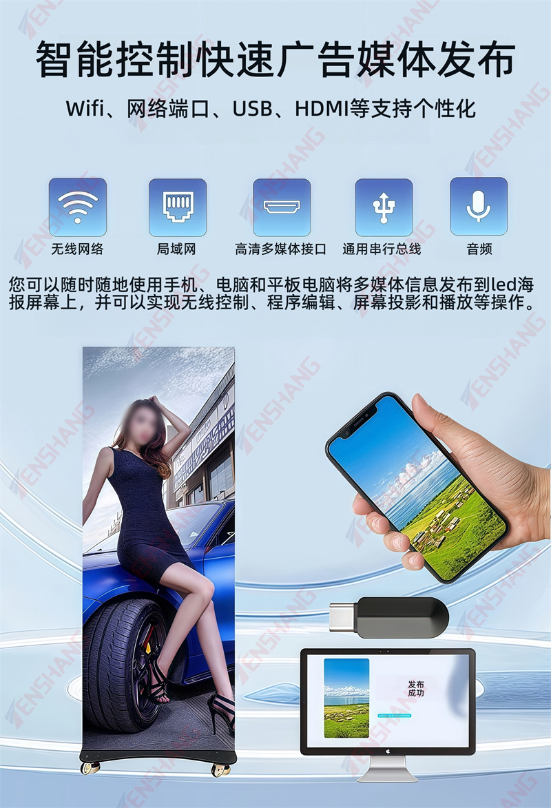 ✅ 无缝拼接 + 全接口兼容:支持多台自由拼接成超大 LED 视频墙,满足大型户外活动、广场大屏、展会主视觉等场景需求;内置 WIFI/ALL LAN/HDMI/APP/USB 多种通讯方式,数据传输稳定,多媒体���件(视频 / 图片 / 文字)一键播放,适配 B 端多样化宣传需求。