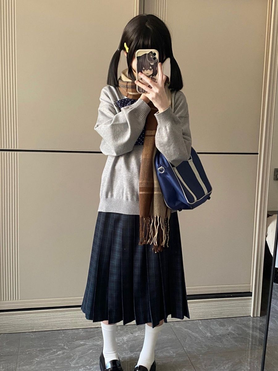 Юбка средней длины в стиле моряка, японский стиль, для миниатюрных, вязаный свитер, длинный рукав, стиль преппи, длинная юбка, осенний и зимний комплект