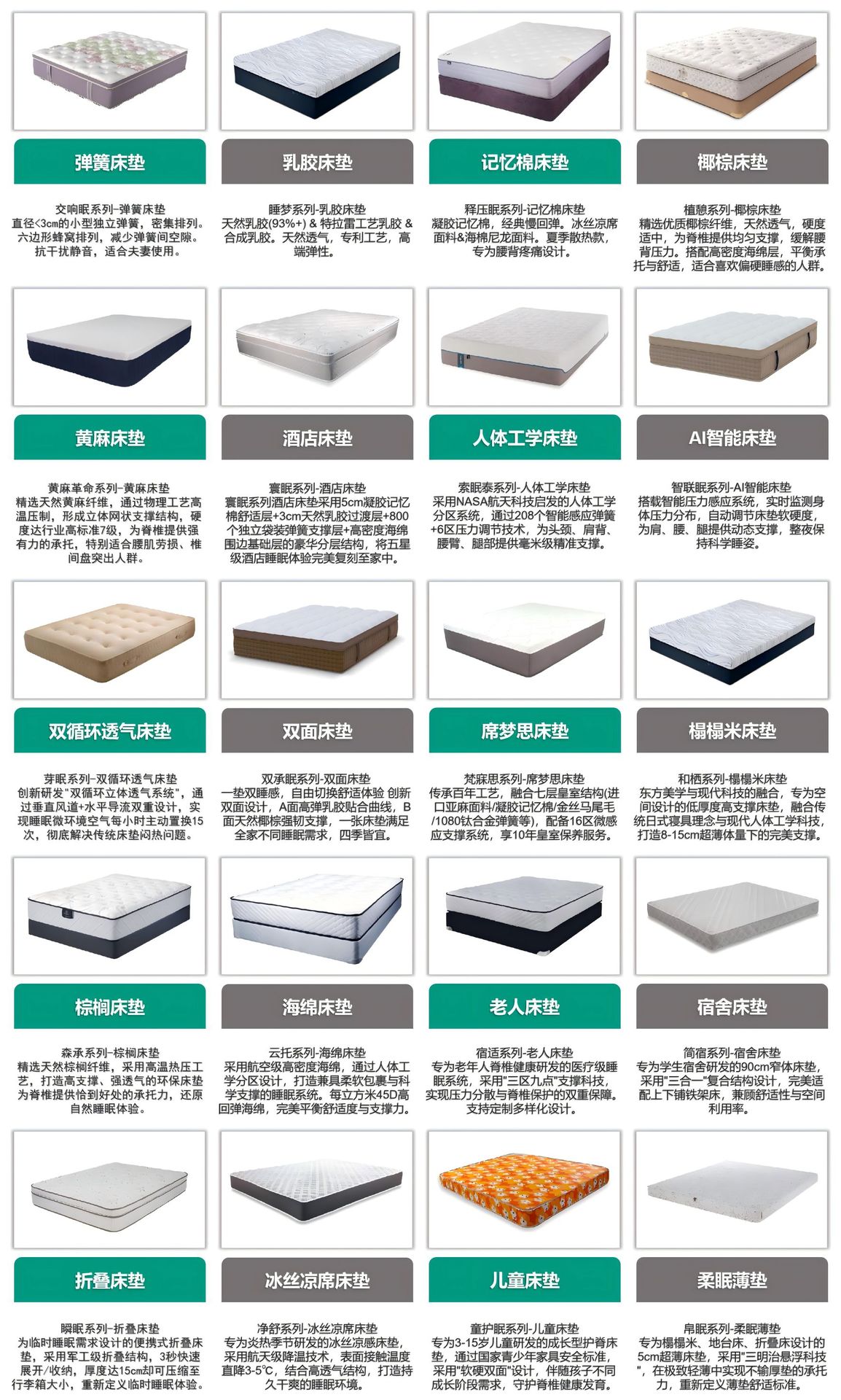 从经典护脊到云端睡感,20种专业方案满足全龄睡眠需求。20个子品牌,以不同硬度、材质与工艺深耕睡眠科技,只为同一使命:让每一夜成为身体的修复之旅。