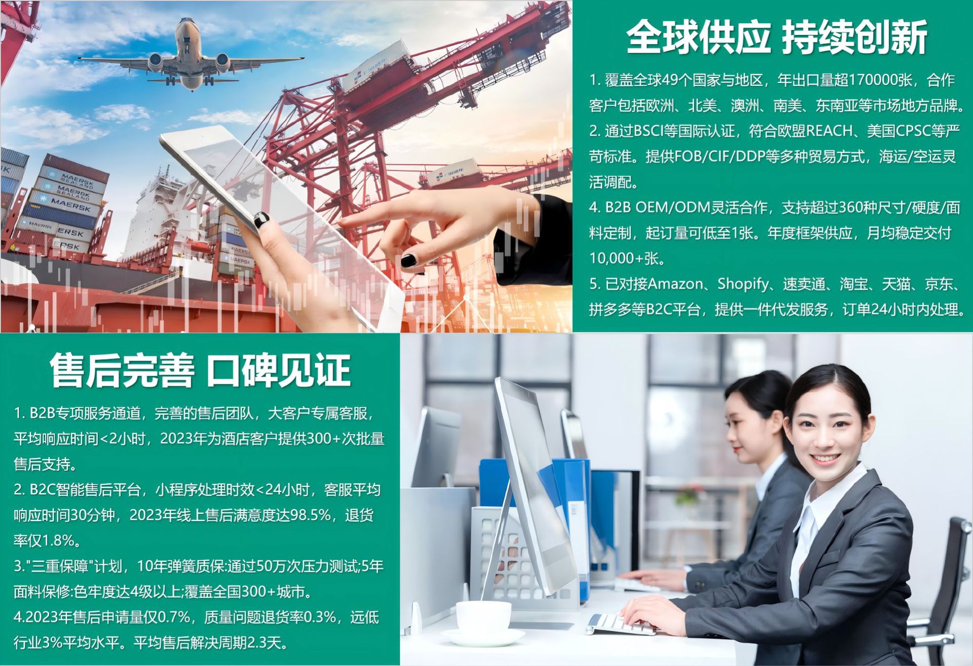 为国际酒店/高端家居商提供差异化床垫方案;模块化生产+快速打样,25天敏捷交付全球市场;专业外贸团队支持,打造符合当地需求的特色产品