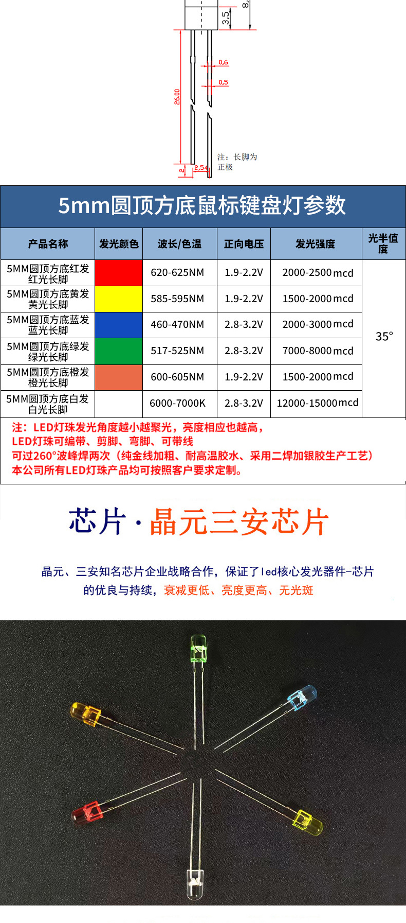 Номер заказа 5mm dome square bottom mouse light f5 square light mechanical keyboard led lamp beads infrared 850nm reverse pole red light yellow light blue light green light orange light white light manufacturer