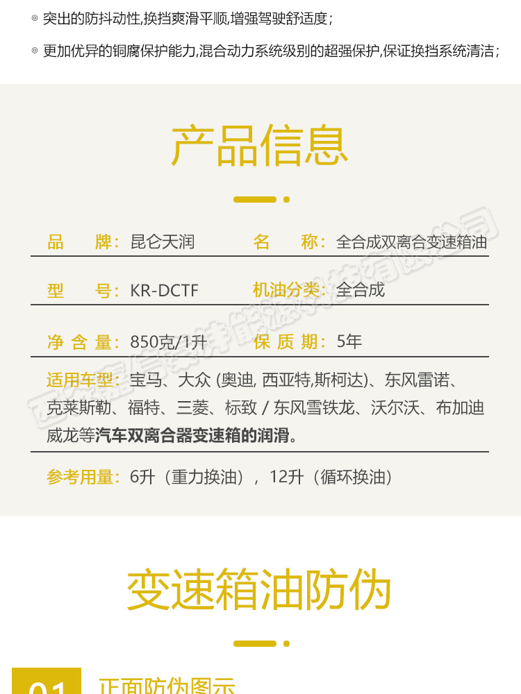 Полностью синтетическое масло для трансмиссий с двойным сцеплением Kunlun Tianrun Kr-Dctf 1 литр