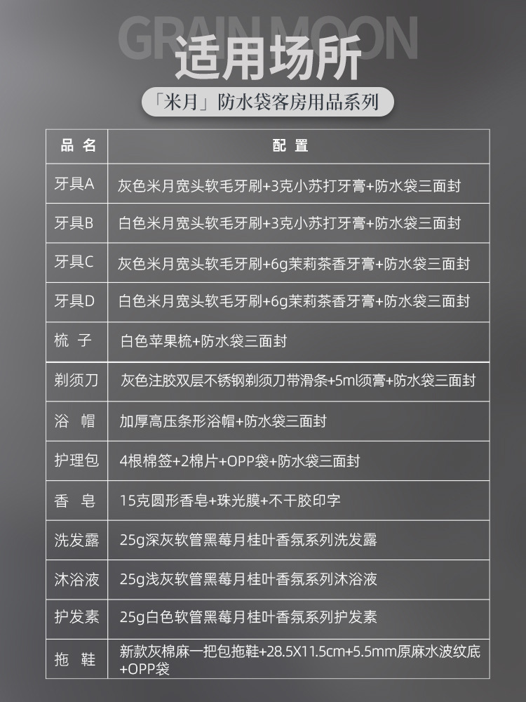 Набор продуктов Disposable slippers, Disposable shower cap, Disposable soap, Disposable razor, Disposable toothbrush, Disposable shower gel, Disposable comb, Disposable shampoo, Disposable toothpaste, Disposable shaving cream, Disposable hair conditioner