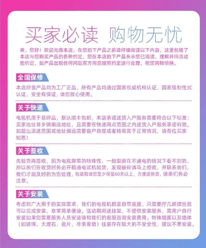 ![]() | 32inch -laser network eye protection version | ¥619.75 / ≈ 7 475 ₽ | 100 | 6149319566235 |