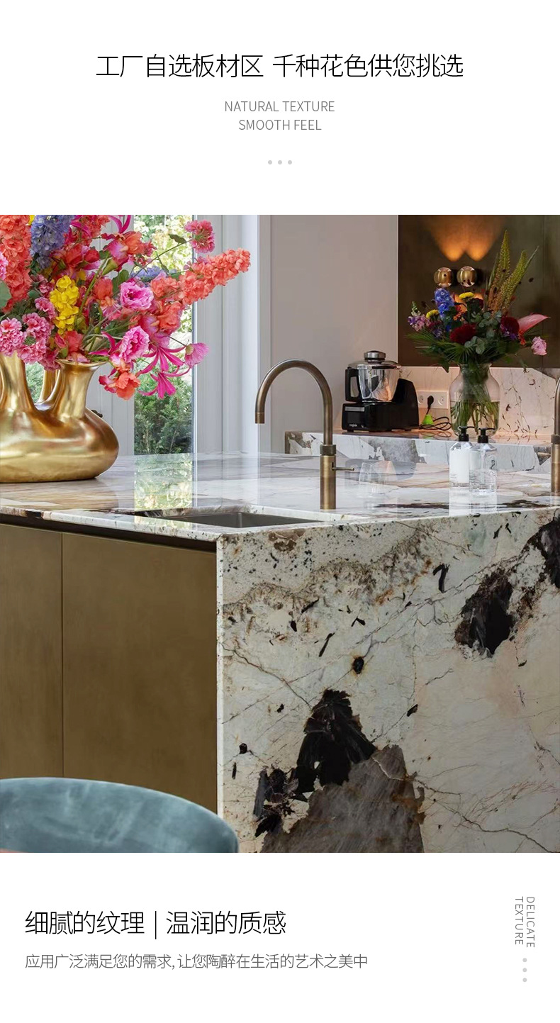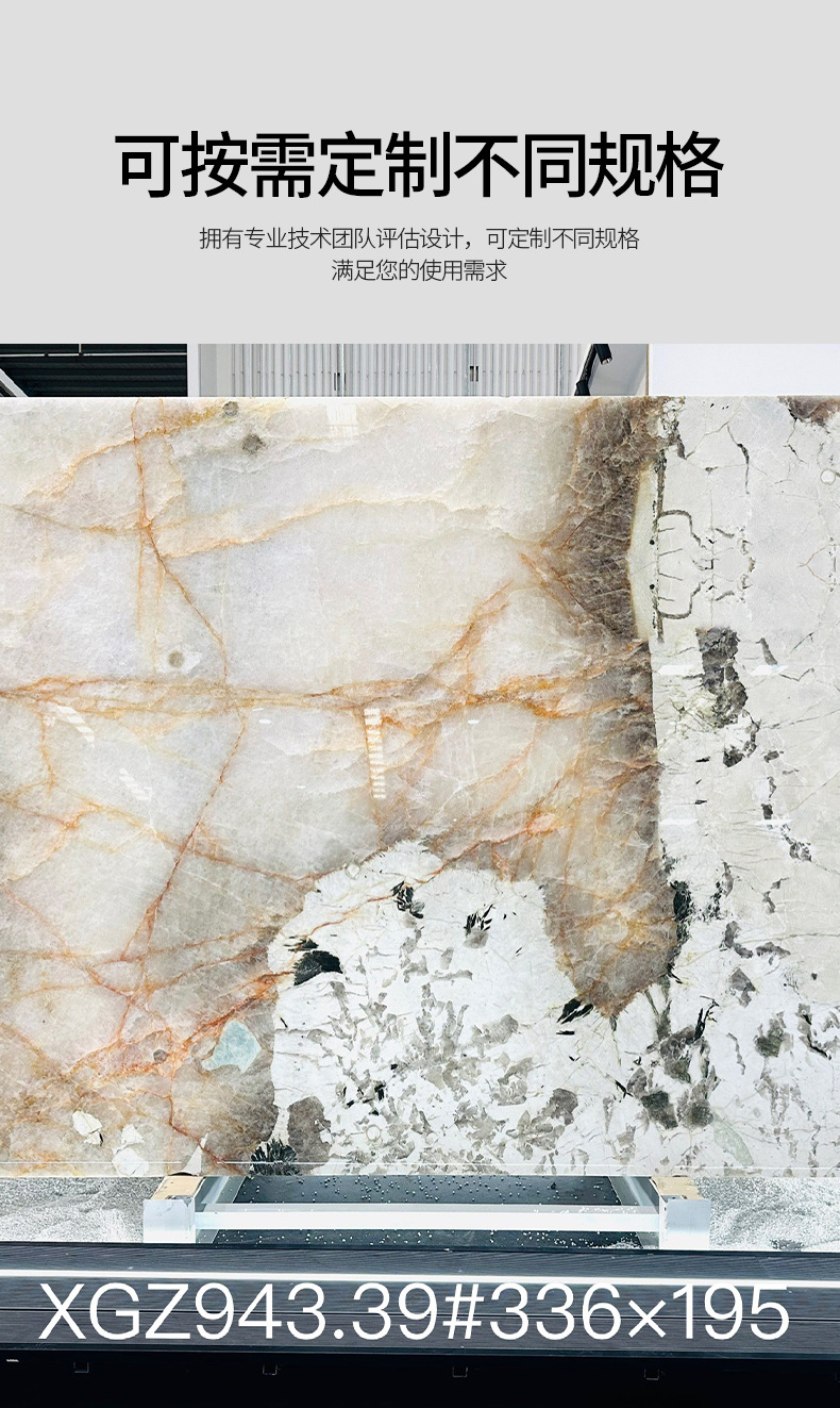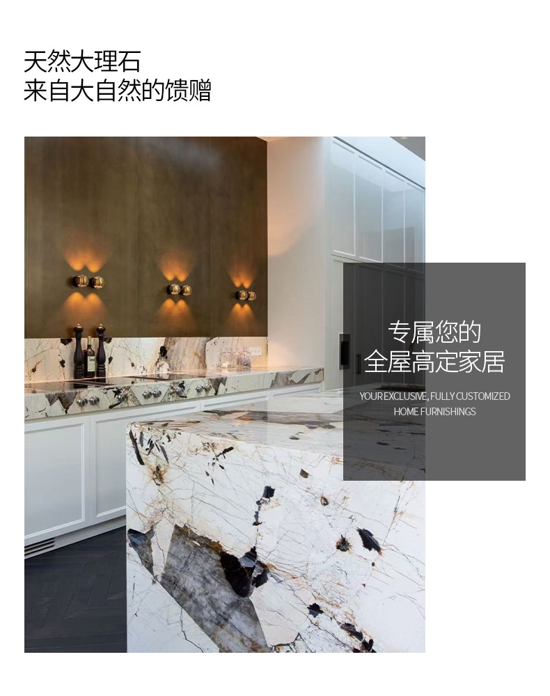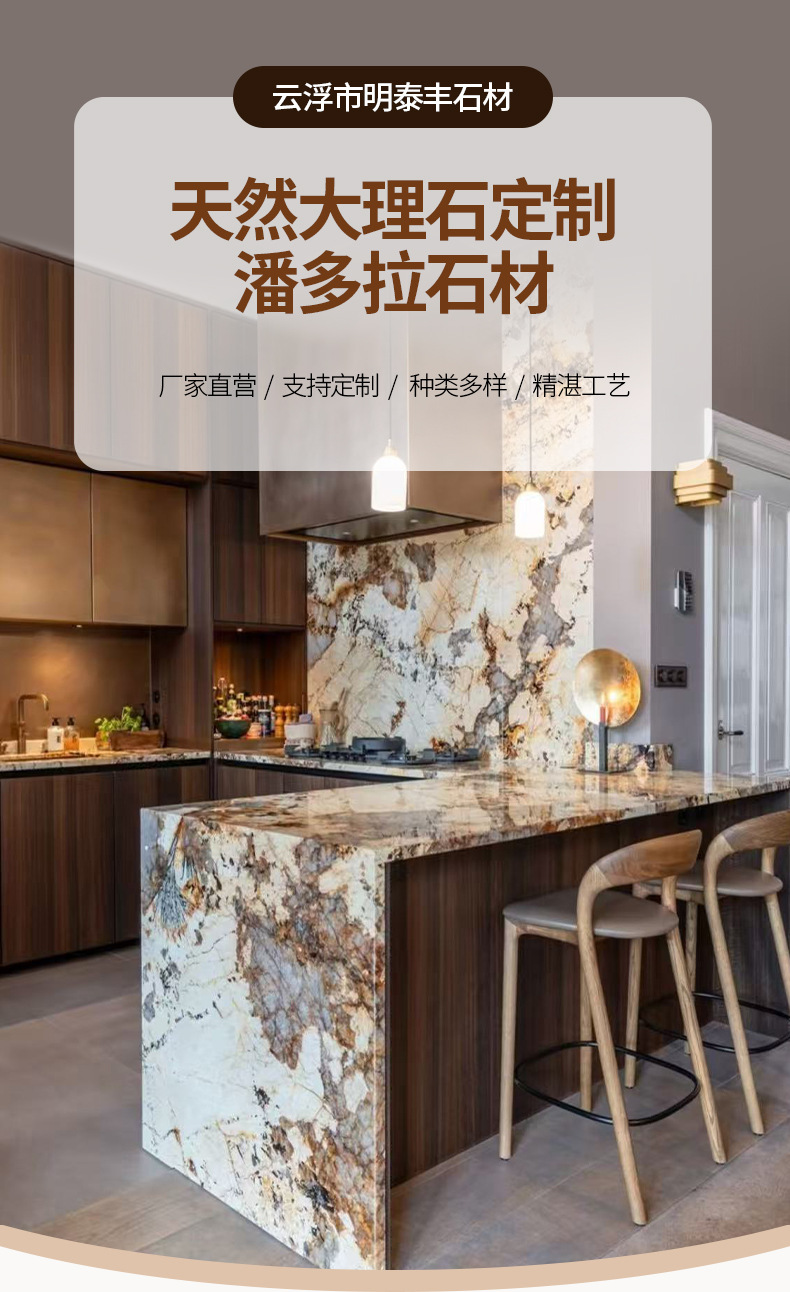 Бразильский натуральный мрамор Пандора, полупрозрачный, большой кристалл, кухонный остров, стена, проект отеля