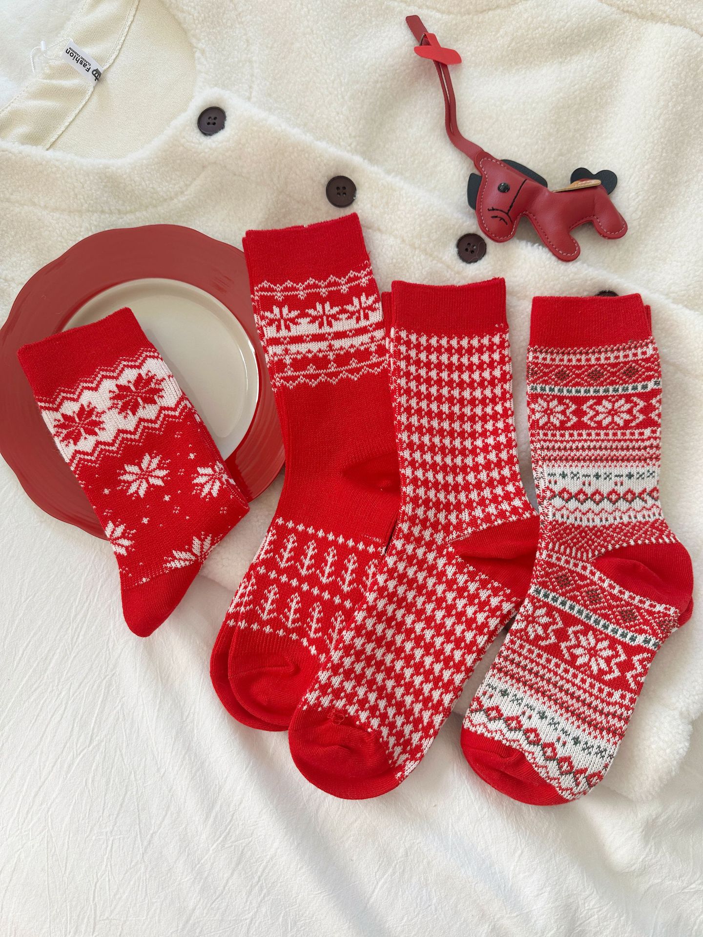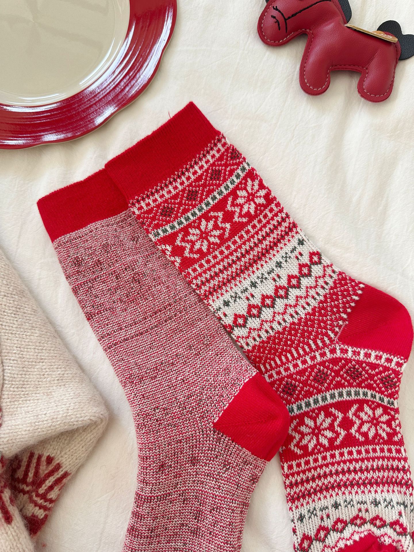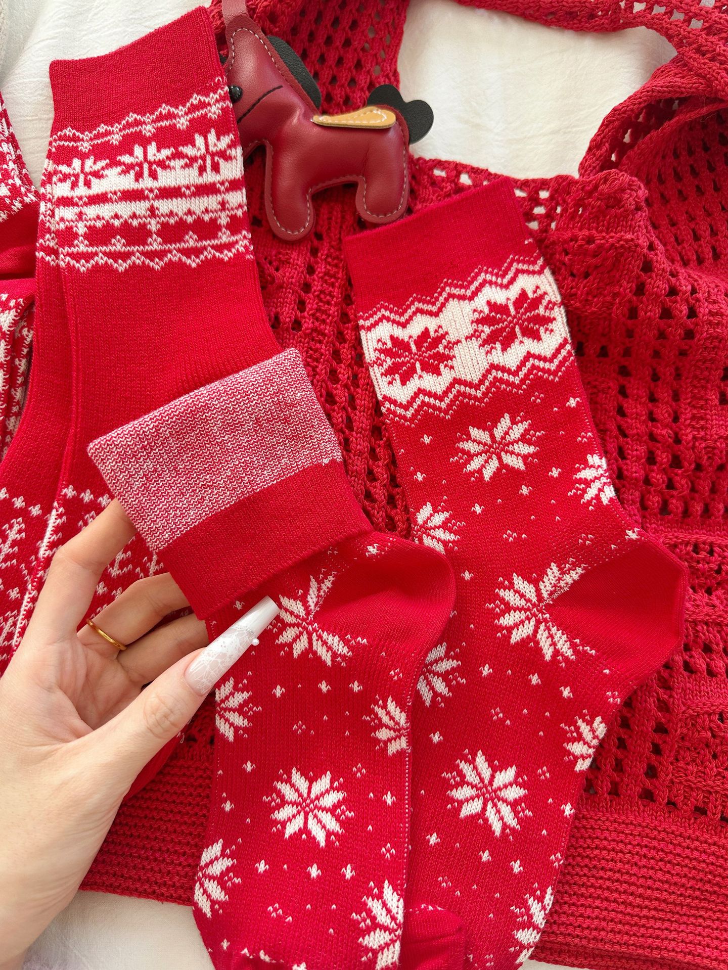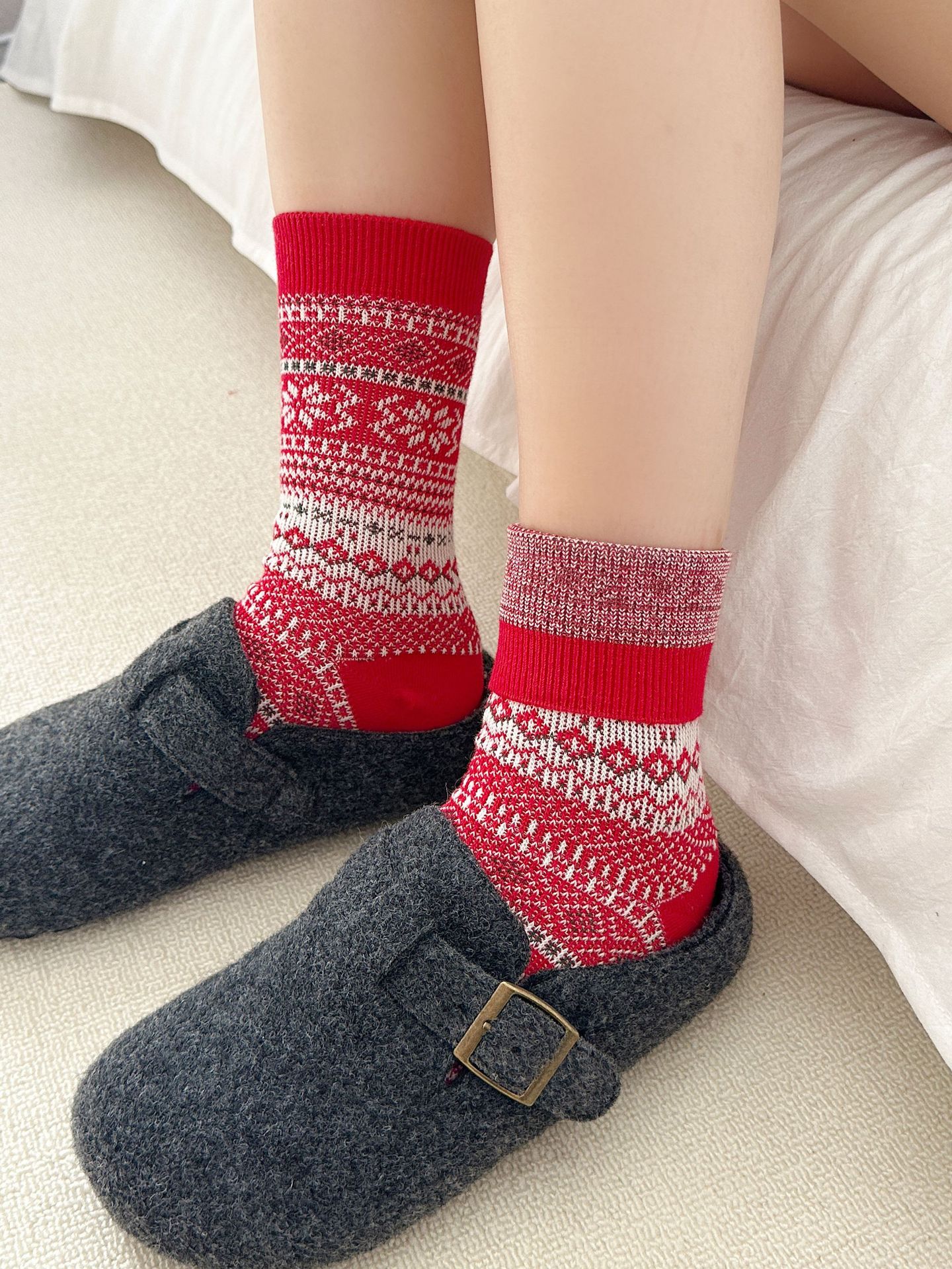 Новогодние красные носки средней длины для женщин, утолщенные, двойная игла, двусторонний чесуча, носки с снежинками на Рождество