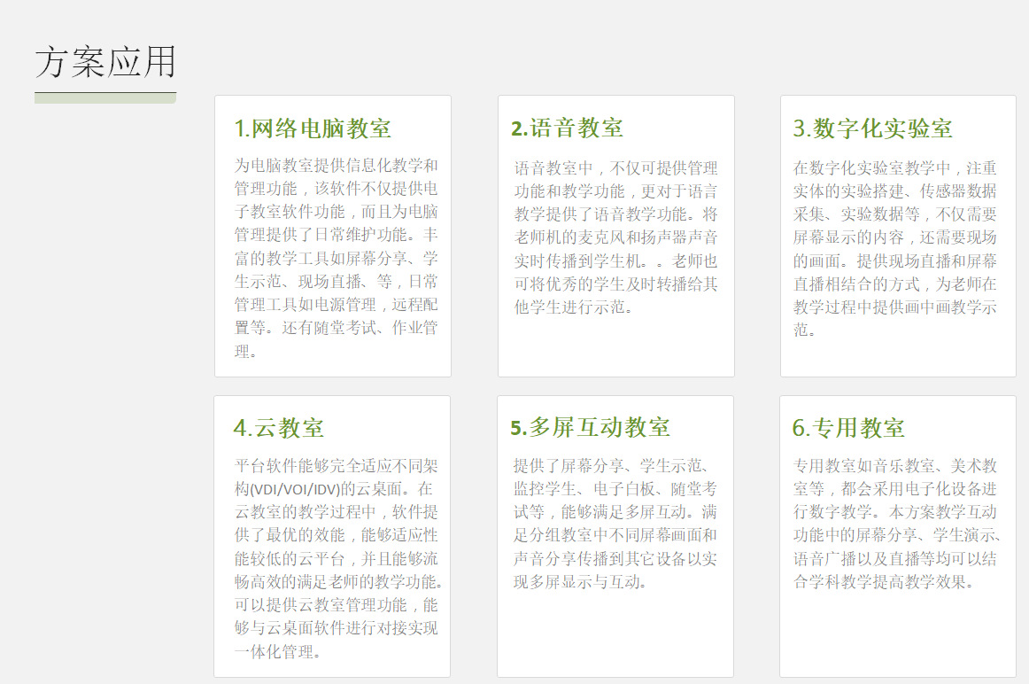 方案中提供设备统一管理维护、智慧教室教学互动软件。功能应用包括设备管理、系统配置、教学互动、作业管理、流媒体教学、电子化考试、电源管理等,能够全面支持学校教学任务和信息化设备管理需求,为老师信息化教学提供智能辅助,充分体现了电脑教室的智慧教和智慧管,让老师管的更轻松、教的更便利。兼容国产化平台,包括X86、ARM和龙芯平台设备,支持麒麟、统信等国产化操作系统。