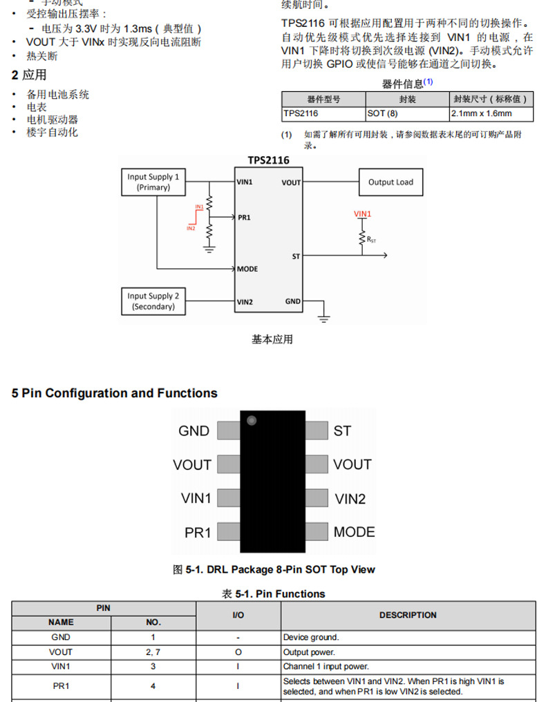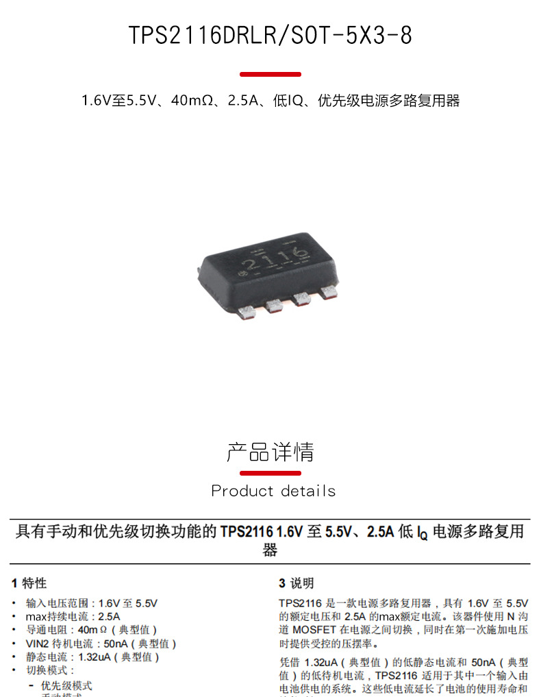 Оригинальный Tps2116Drlr Sot-5X3-8 1.6V до 5.5V мультиплексор с низким Iq приоритетом питания