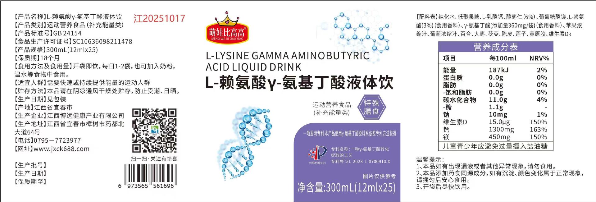 L-лизин Y-аминомасляная кислота жидкий напиток для детей и подростков добавка кальция для роста 300 мл