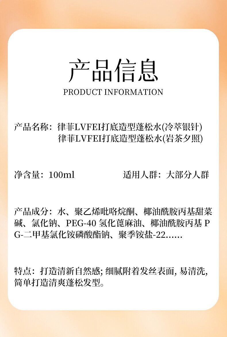 ![]() | Lvfei bottom styling fluffy water (rock tea sunset) | ¥3.2 / ≈ 39 ₽ | 51707 | 5981591756164 | |