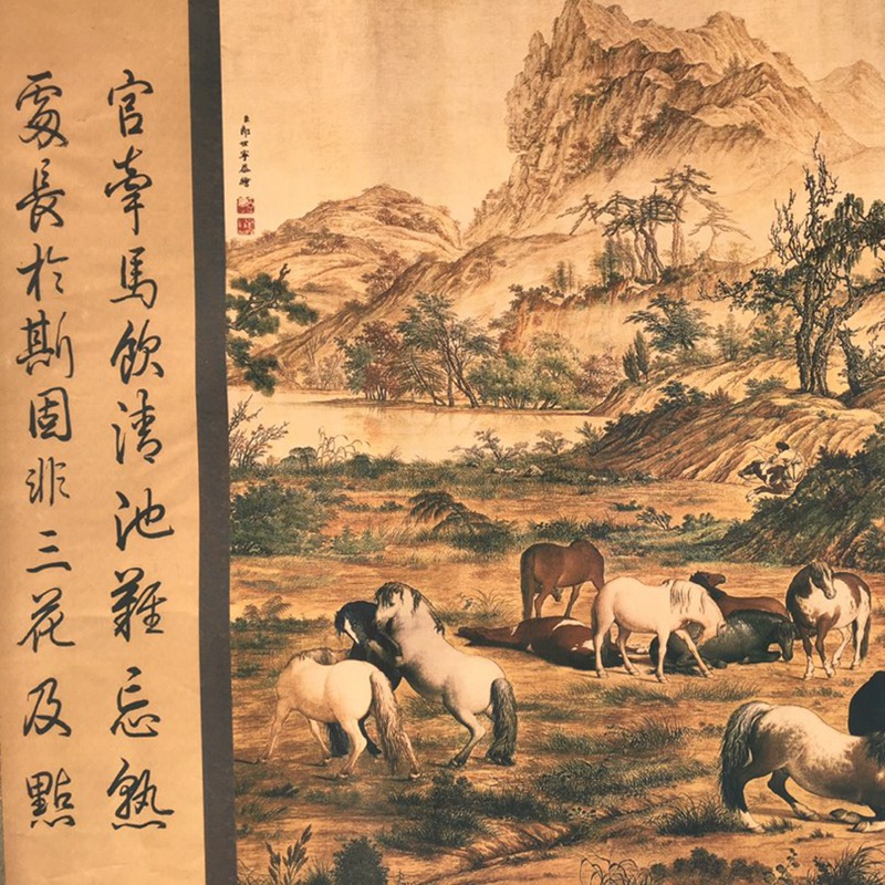 Антикварная оптовая брошюра, подвесная картина, длинный свиток, картина Сотни лошадей, декор для офиса, картина для гостиной