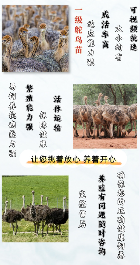 本商品是活体鸵鸟,因品种和饲养时间不一样,价格也不一样。有非洲鸵鸟,澳洲鸵鸟(鸸鹋)大小都有。