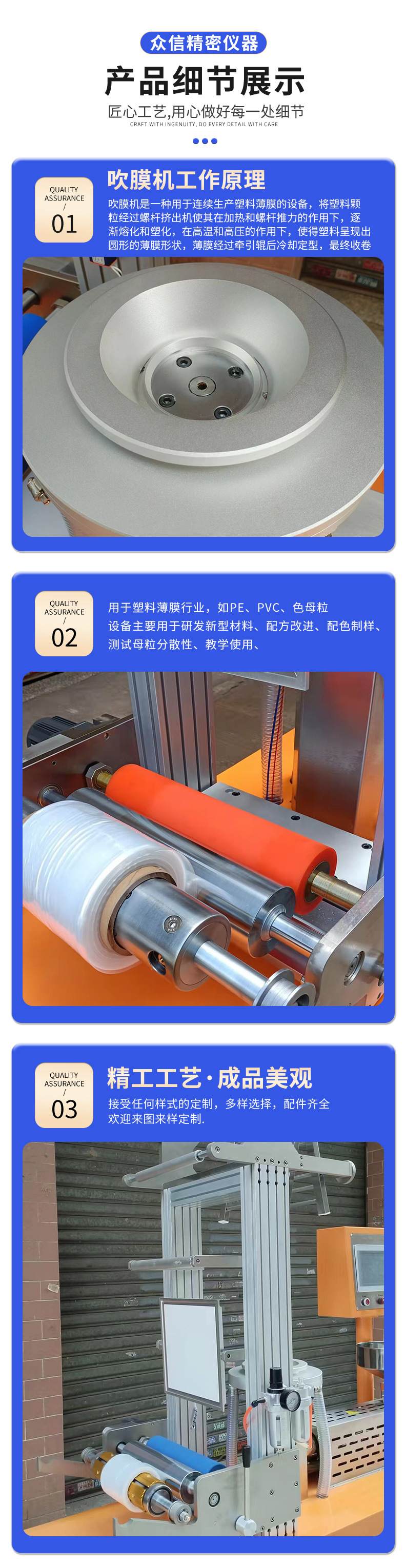 是将加热融化再吹成薄膜,首先将干燥的聚乙烯粒子加入下料斗中,靠粒子本身的重量从料斗进入螺杆,当粒料与螺纹斜棱接触后,旋转的斜棱面对塑料产生与斜棱面相垂直的推力,将塑料粒子向前推移,推移过程中,由于塑料与螺杆、塑料与机筒之间的摩擦以及粒子间的碰撞磨擦,同时还由于料筒外部加热而逐步溶化。熔融的塑料经机头过滤去杂质从模头模口出来,经风环冷却、吹胀经人字架,牵引辊,收卷成品薄膜卷成筒的过程,