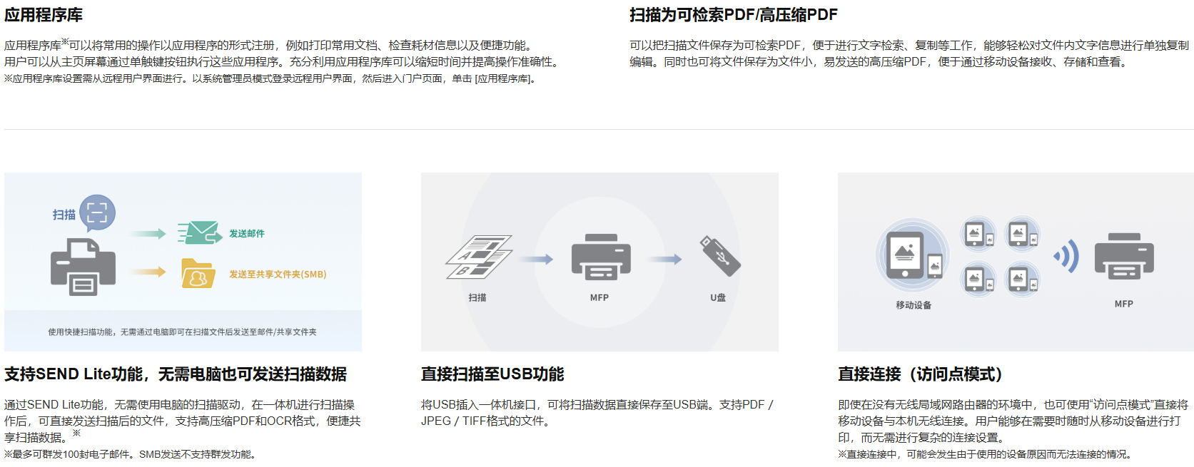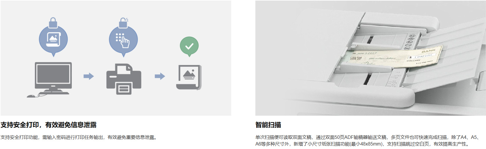 特殊复印功能:缩放复印,2合1复印,4合1复印,ID卡复印,护照复印,消除黑框等