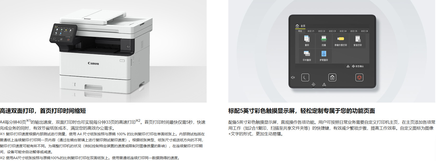 黑白打印速度 单面:40ppm(A4),65.4ppm(A5横)