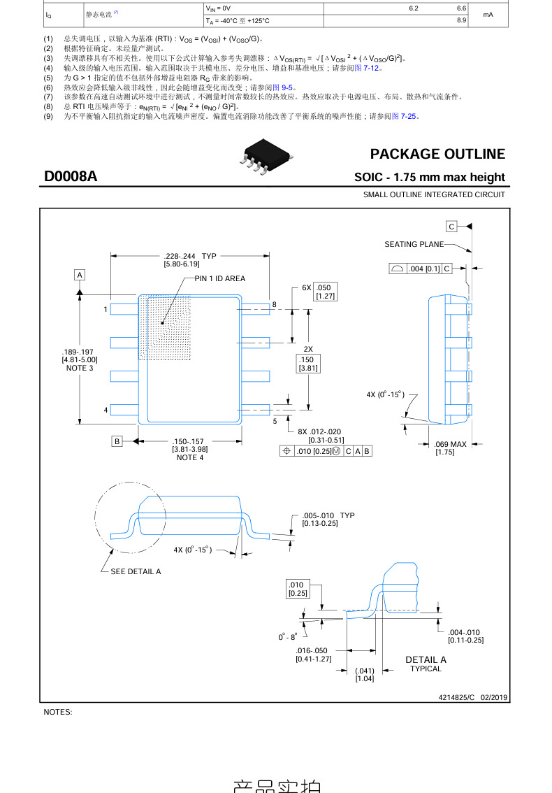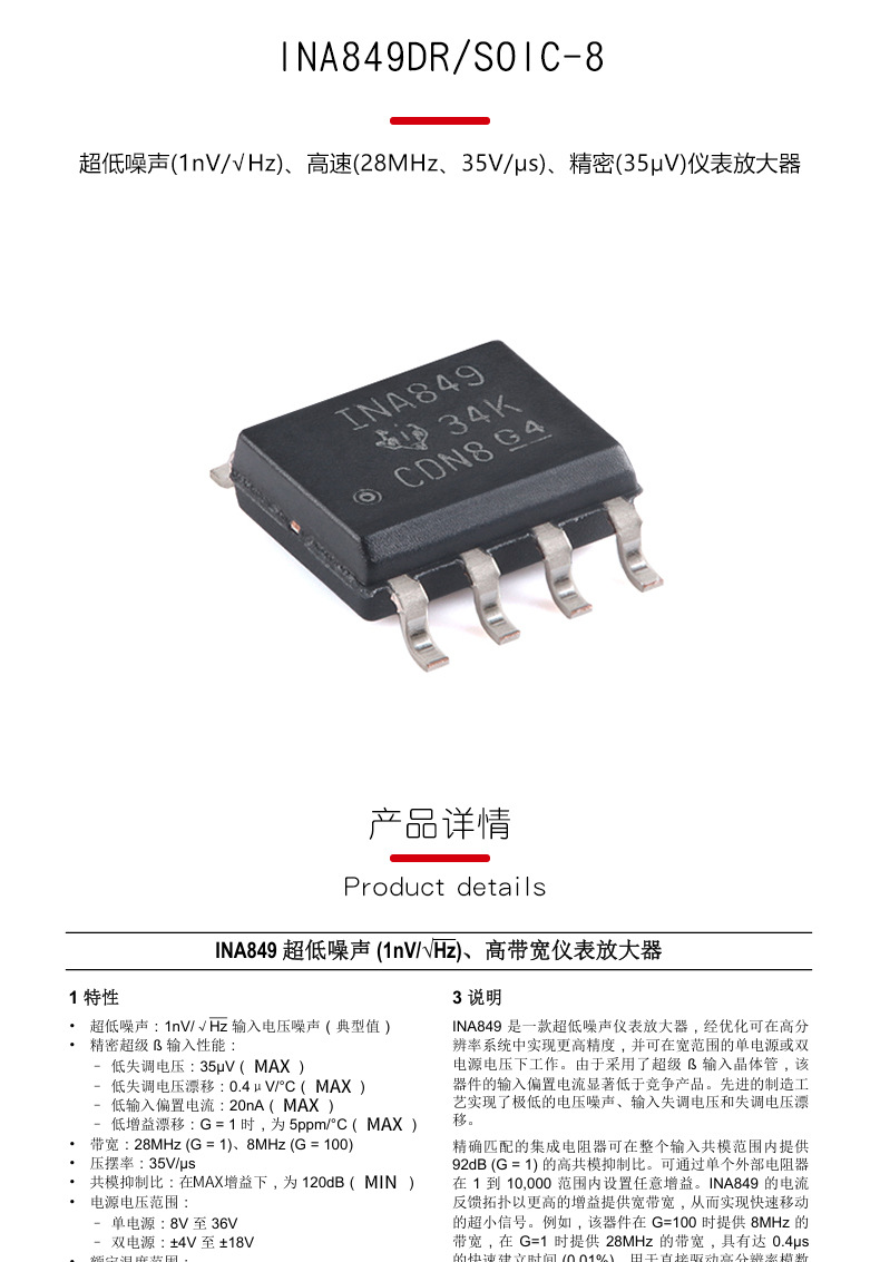 Оригинальный Ina849Dr Soic-8 низкий шум (1Нв/√Гц), высокоскоростной 28МГц инструментальный усилитель