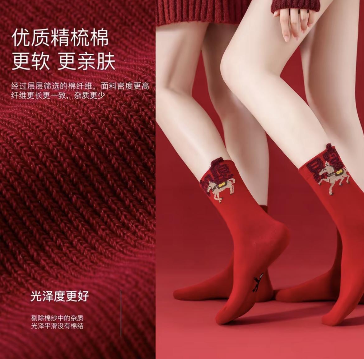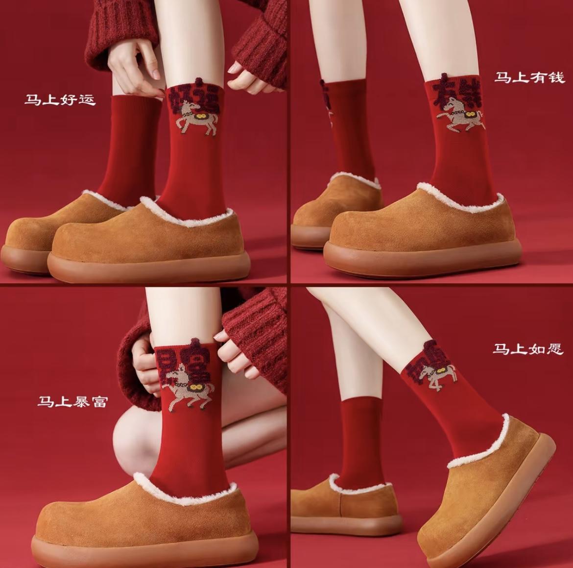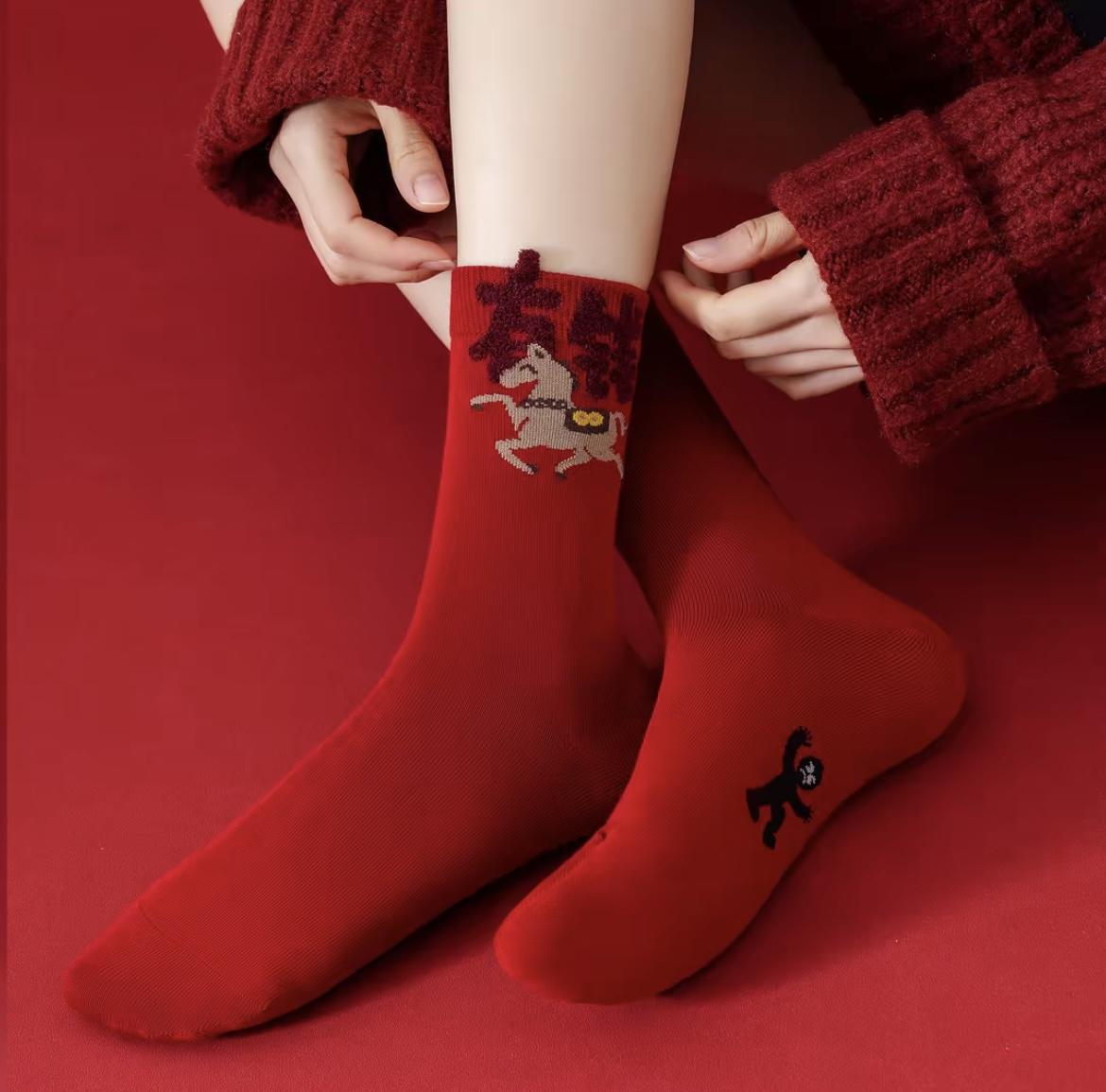 Теплые зимние новогодние красные носки в китайском стиле жаккард средней длины для мужчин и женщин, не выцветают, модный зимний новый стиль, год лошади