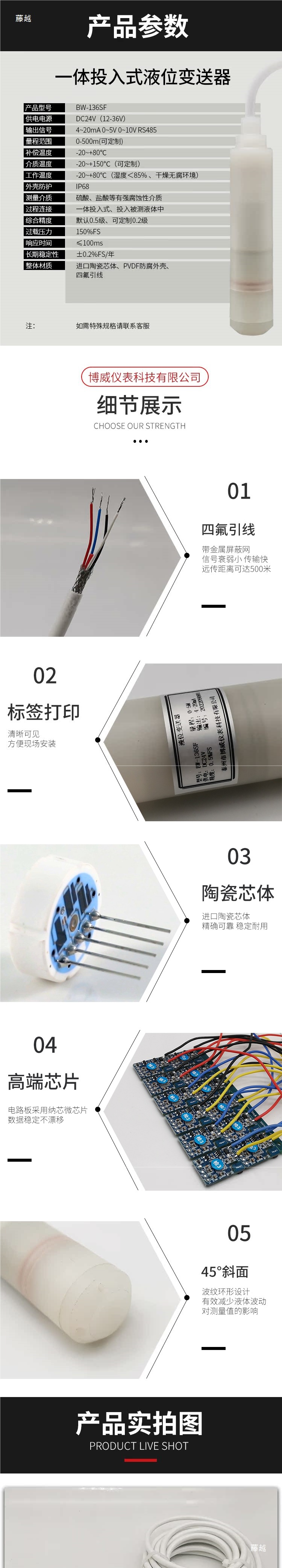 Интегрированный погружной датчик уровня жидкости Subowei, PTFE, антикоррозийный, кислотостойкий, 4-20Ma
