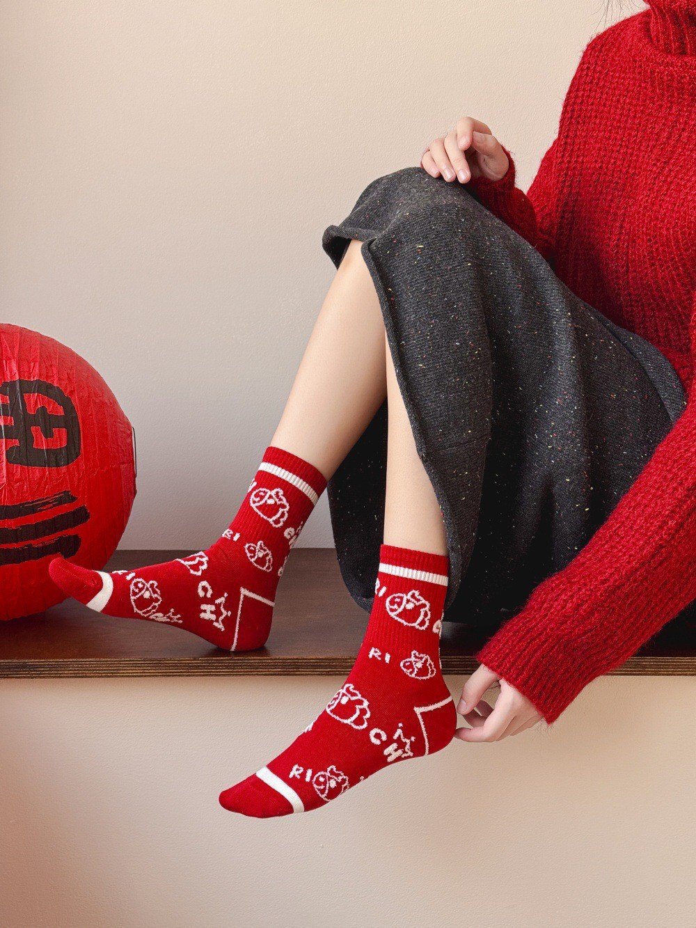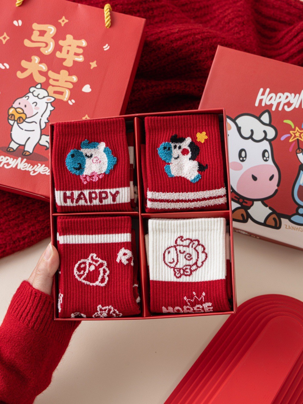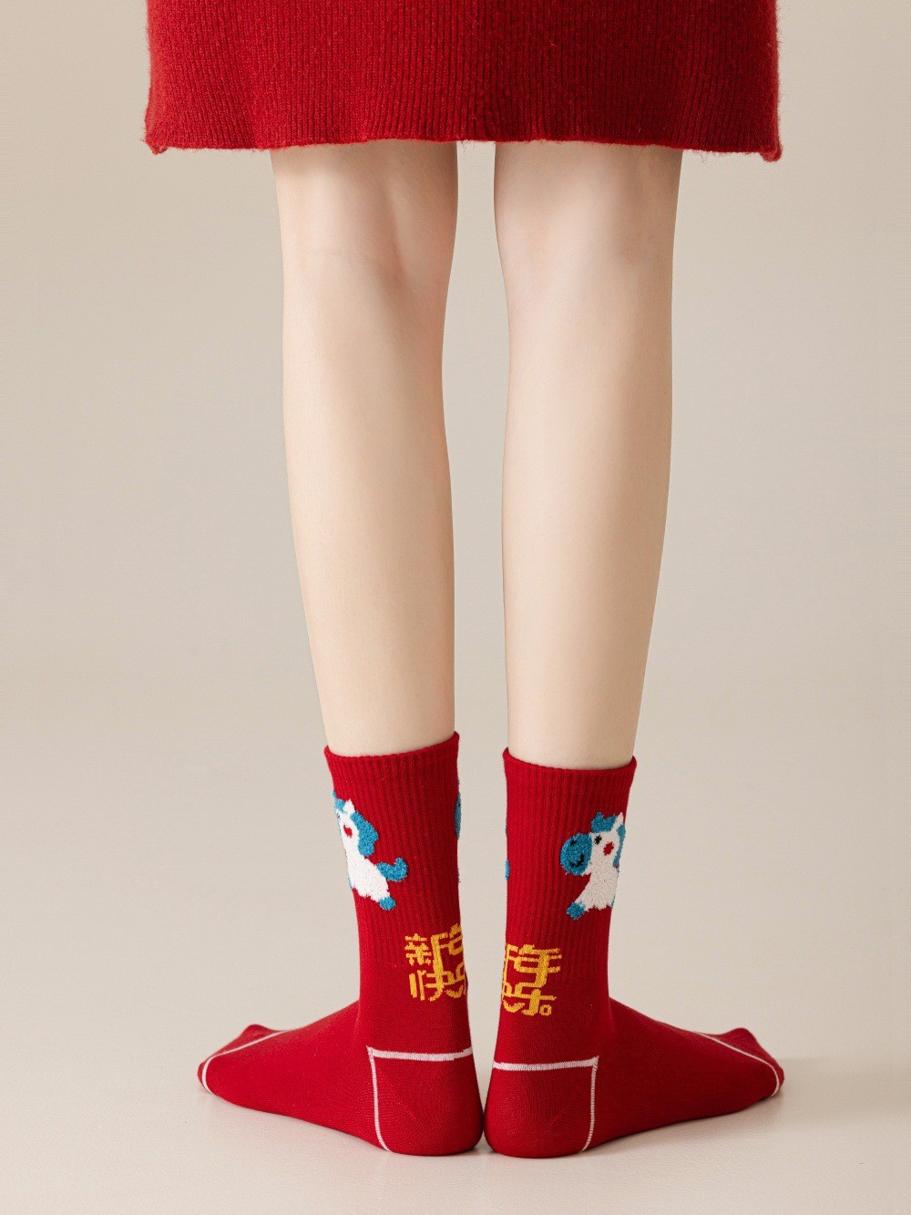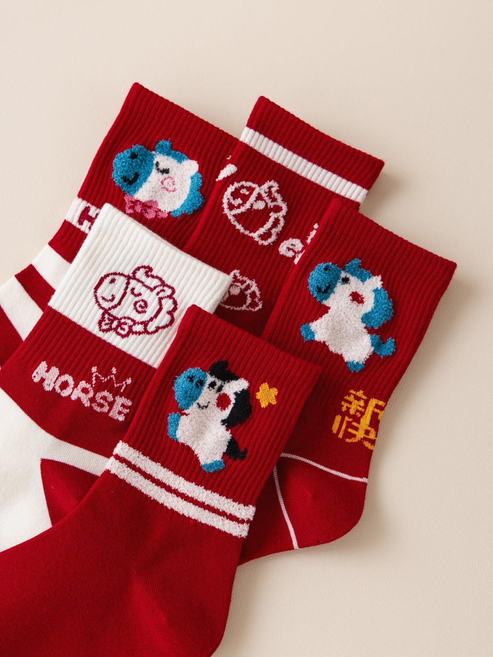Носки на Новый год 2026 года Лошади для женщин, красные, высокоэластичные, милые с мультяшным пони, женские носки до середины икры из хлопка
