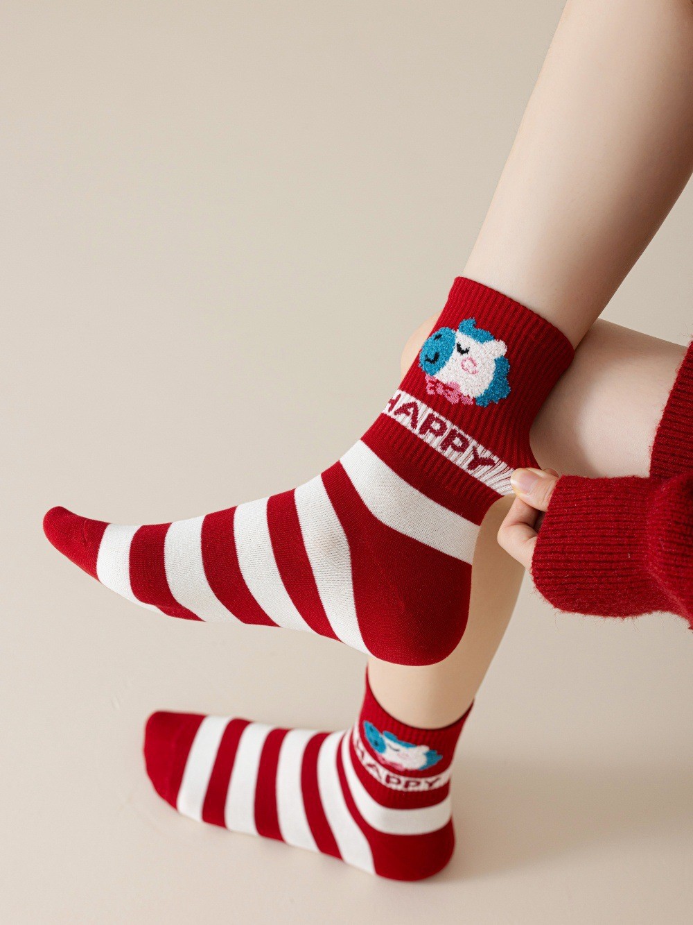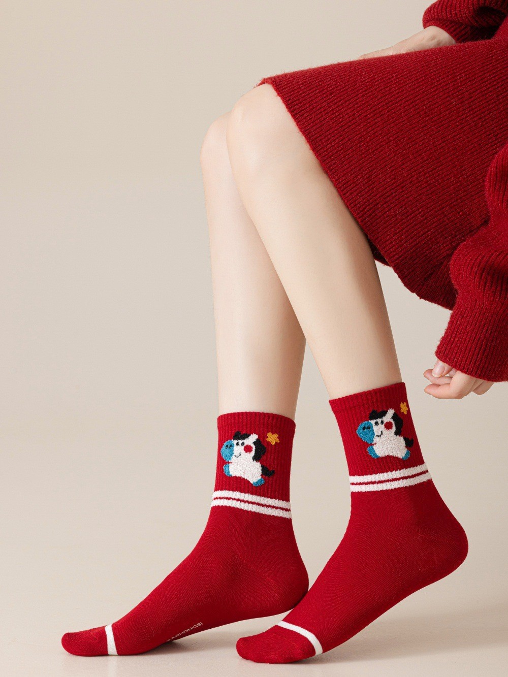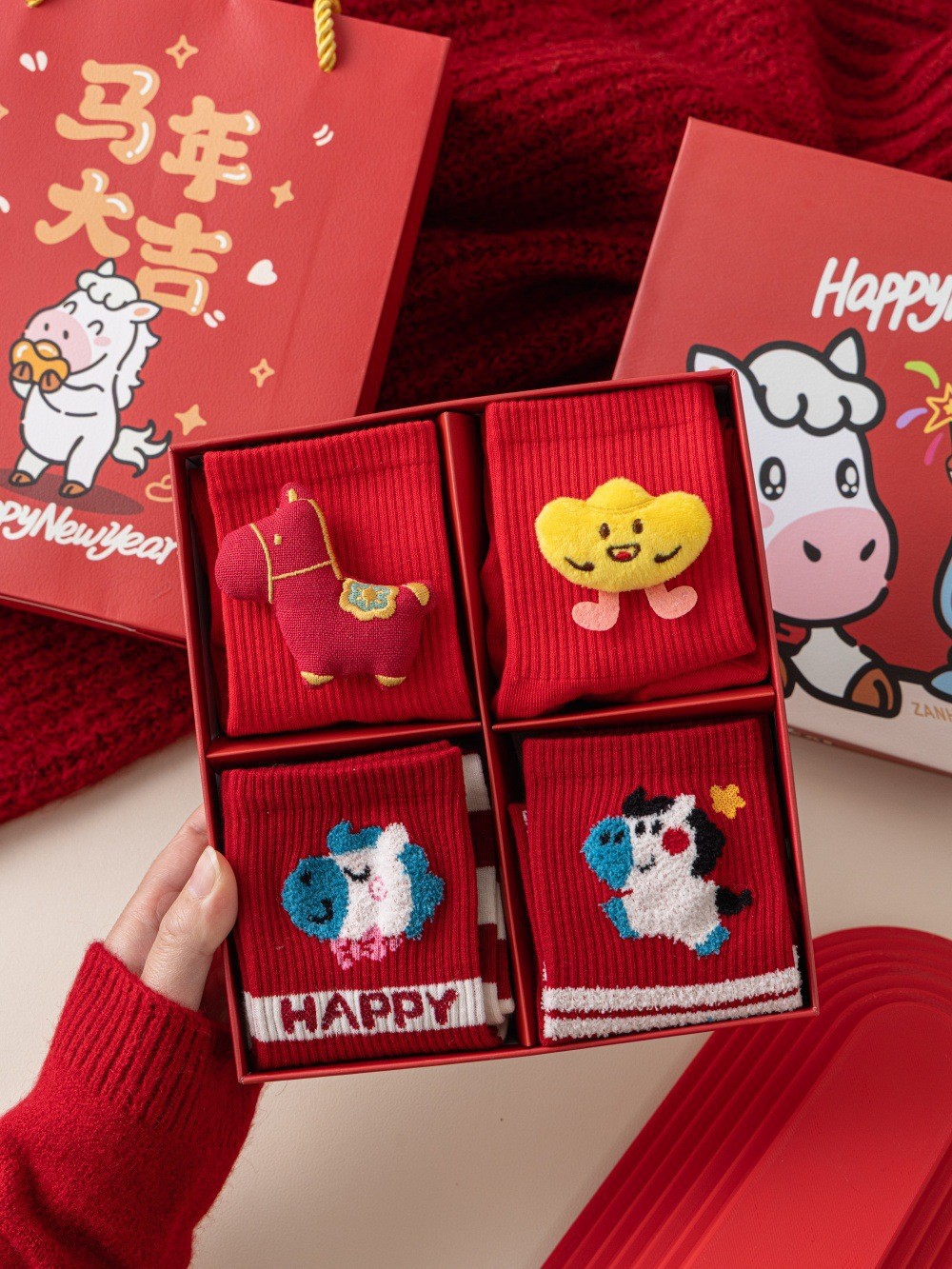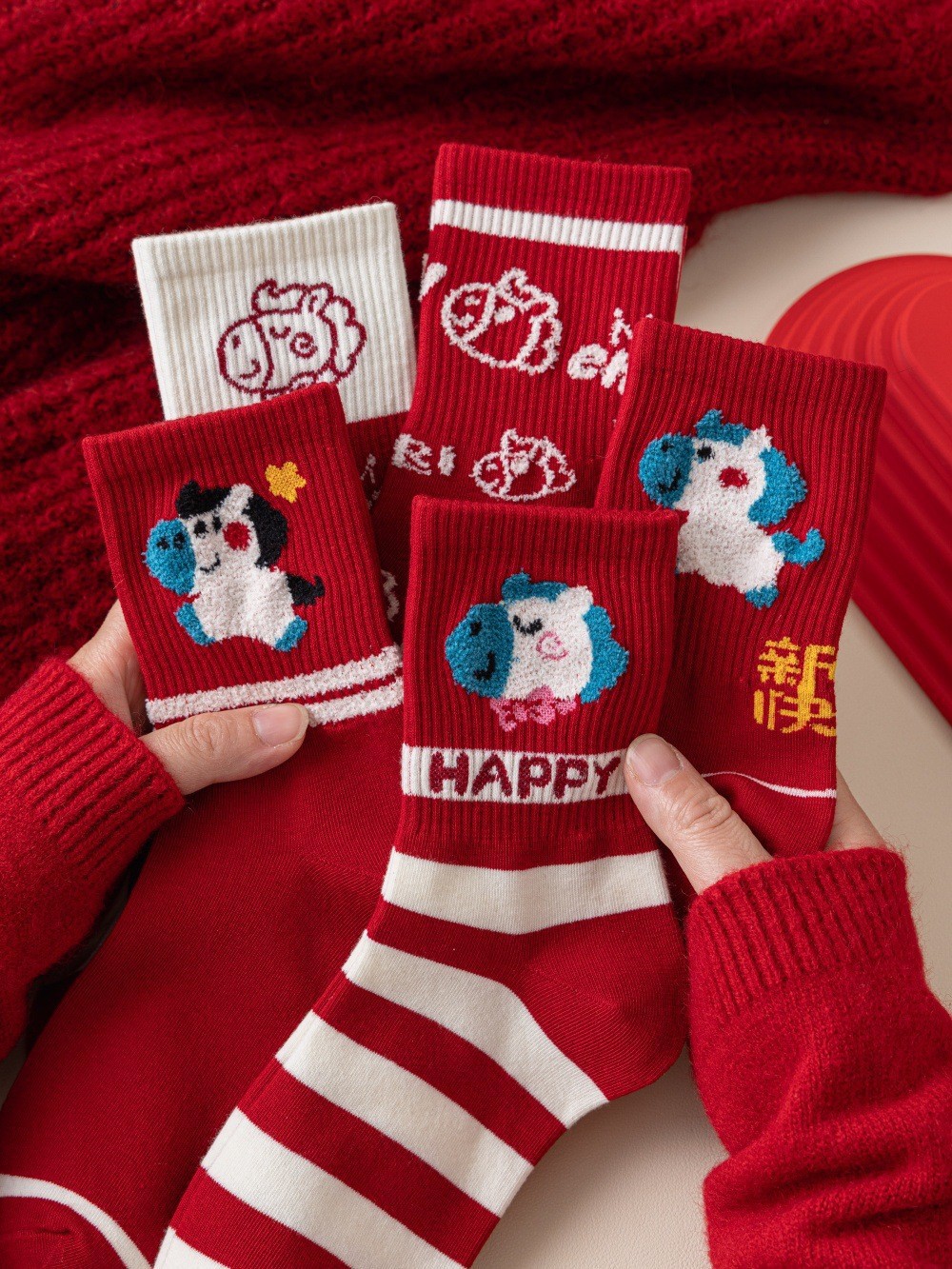 Носки на Новый год 2026 года Лошади для женщин, красные, высокоэластичные, милые с мультяшным пони, женские носки до середины икры из хлопка
