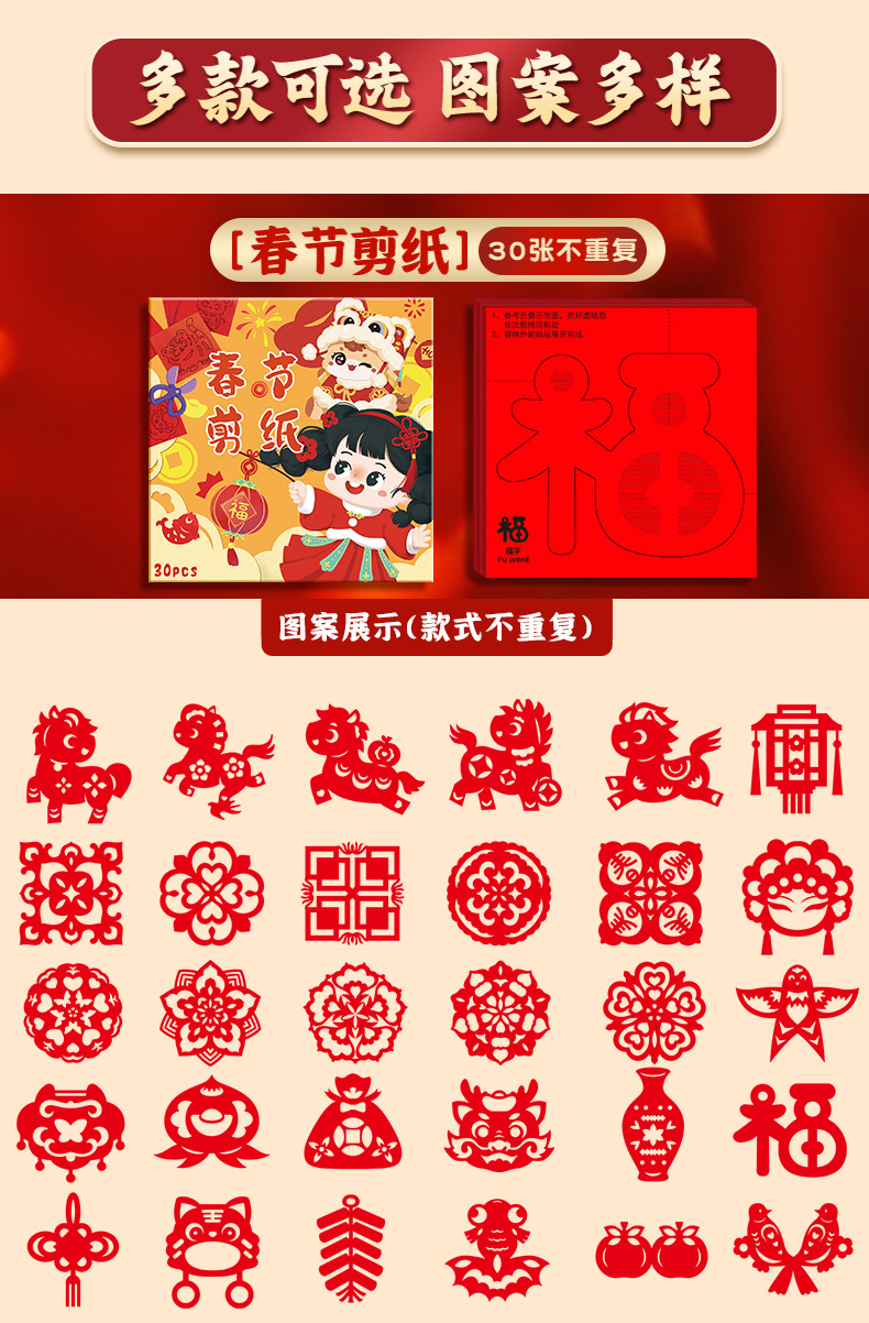 ![]() | [spring festival paper cutting] 30 non-repeating sheets/free scissors + glue stick + traceless glue | ¥2.8 / ≈ 34 ₽ | 7603 | 6153484178471 | |